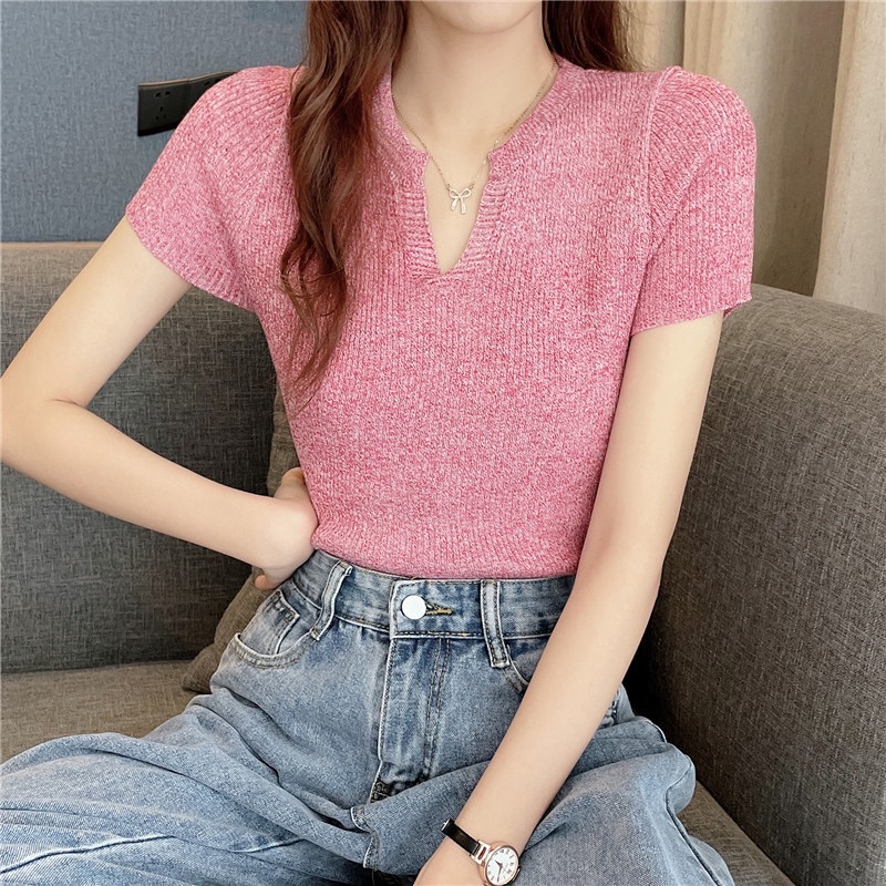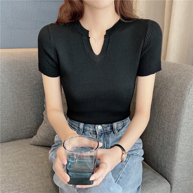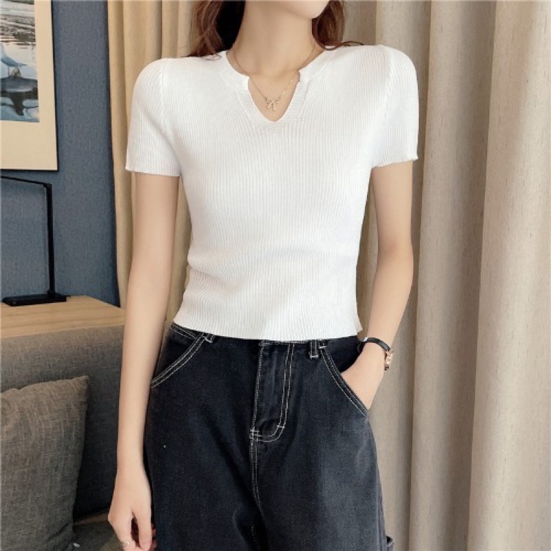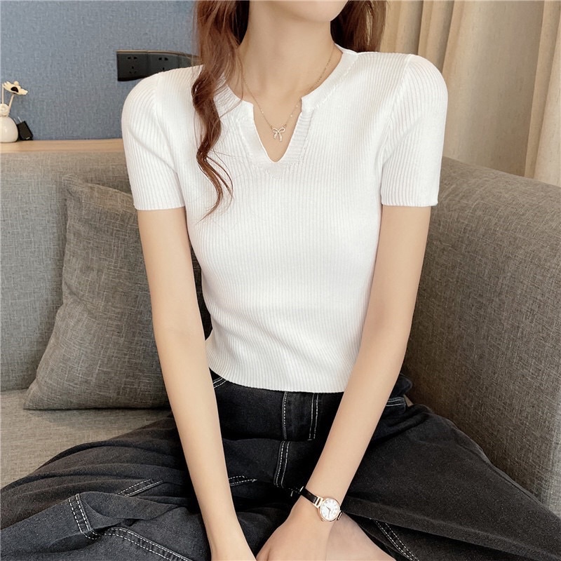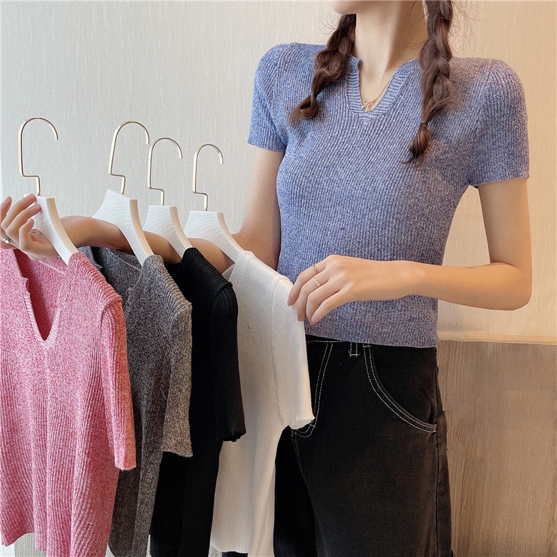 Áo croptop len tăm dệt kim nữ tay ngắn cổ v polo phong cách Hàn Quốc New Arival