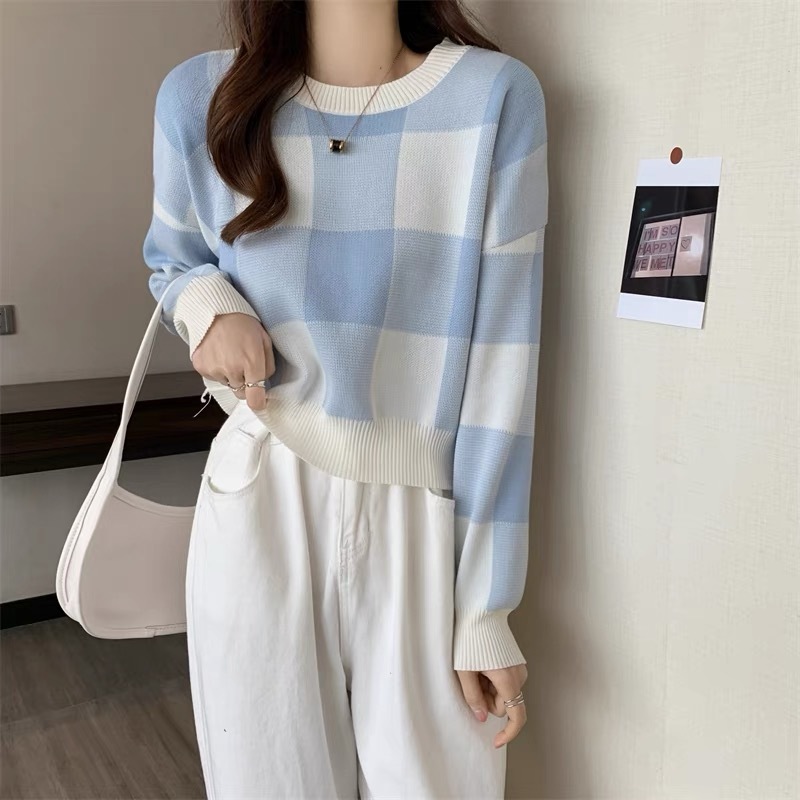 Áo sweater len dệt kim tay dài nữ dáng rộng croptop kiểu họa tiết kẻ caro cổ tròn len mongtoghi phong cách Hàn Quốc