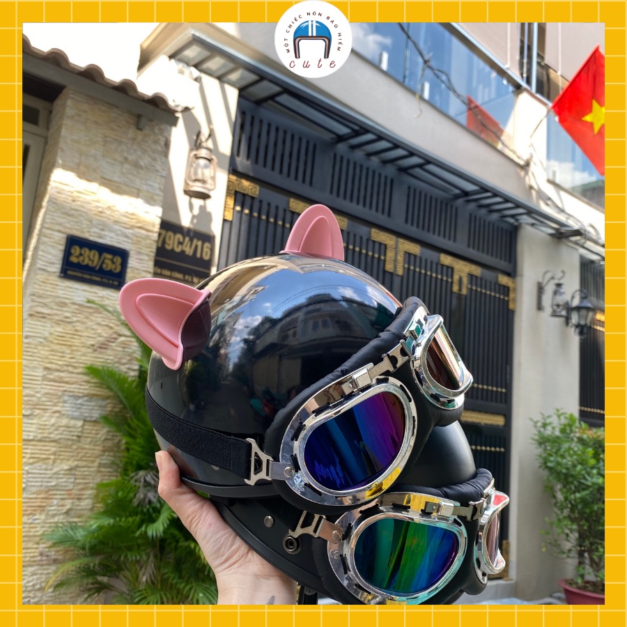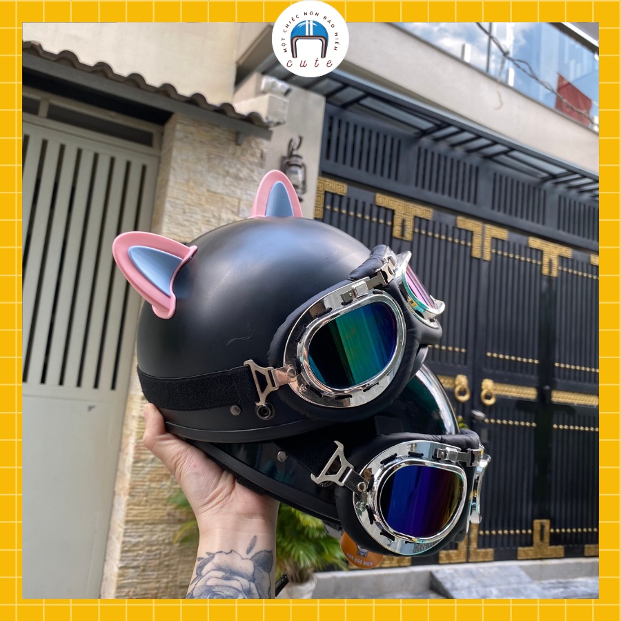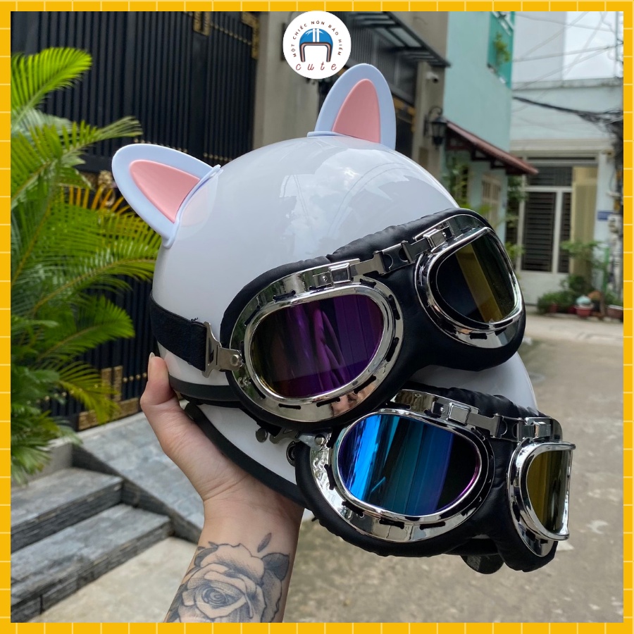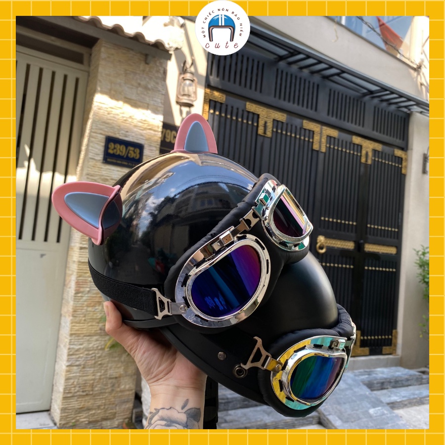 [TẶNG IN TÊN] Nón Bảo Hiểm Nửa Đầu Kính Phi Công Kèm Phụ Kiện Tai Mèo 2 Màu Dễ Thương Chất Liệu ABS Dày 3 Lớp Có Tem QC