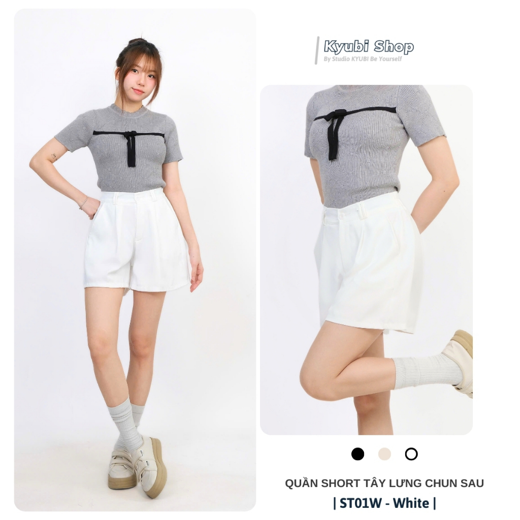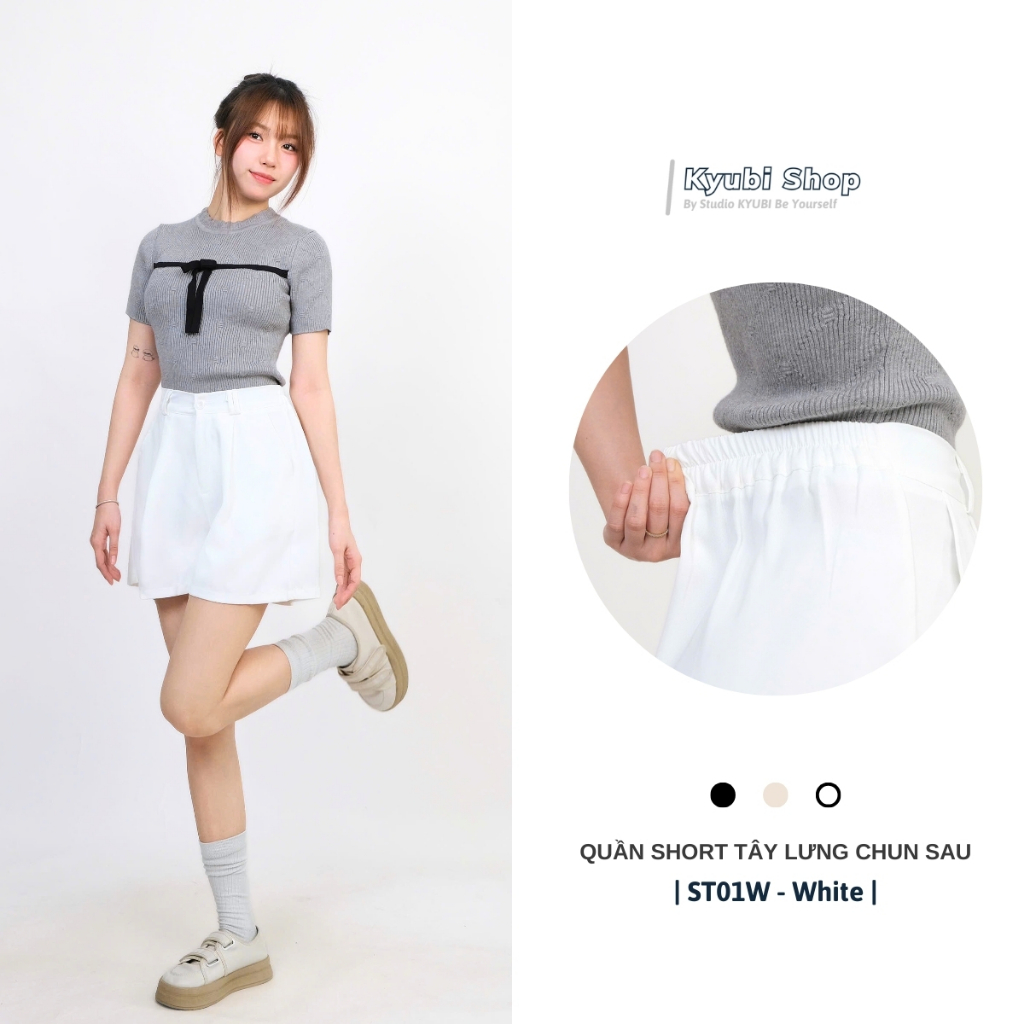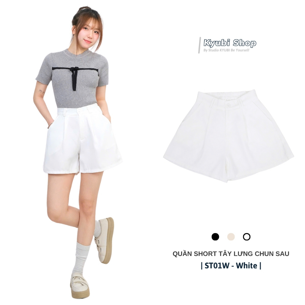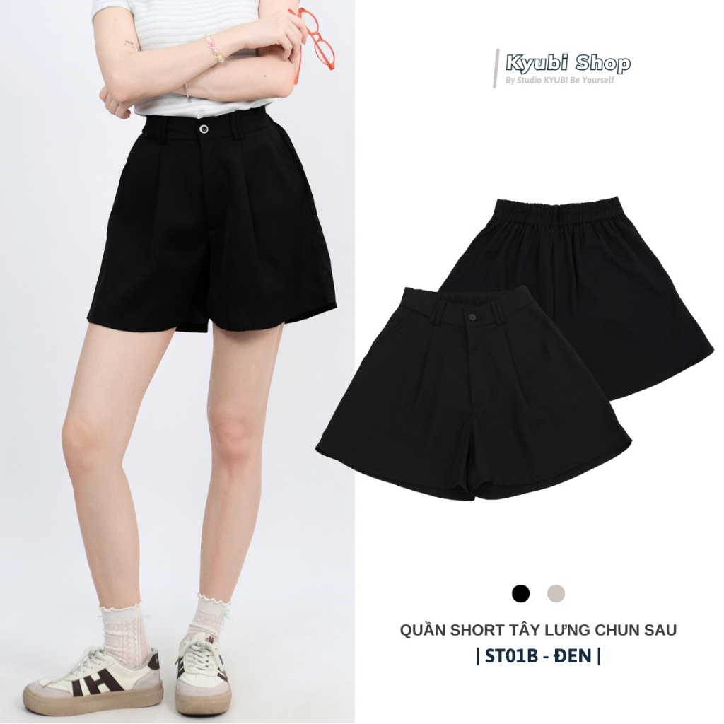 Quần đùi short ống rộng nữ cạp chun sau lưng cao xếp ly (có bigsize) nhiều màu đen kem trắng - Quần ngố tây KYUBI ST01