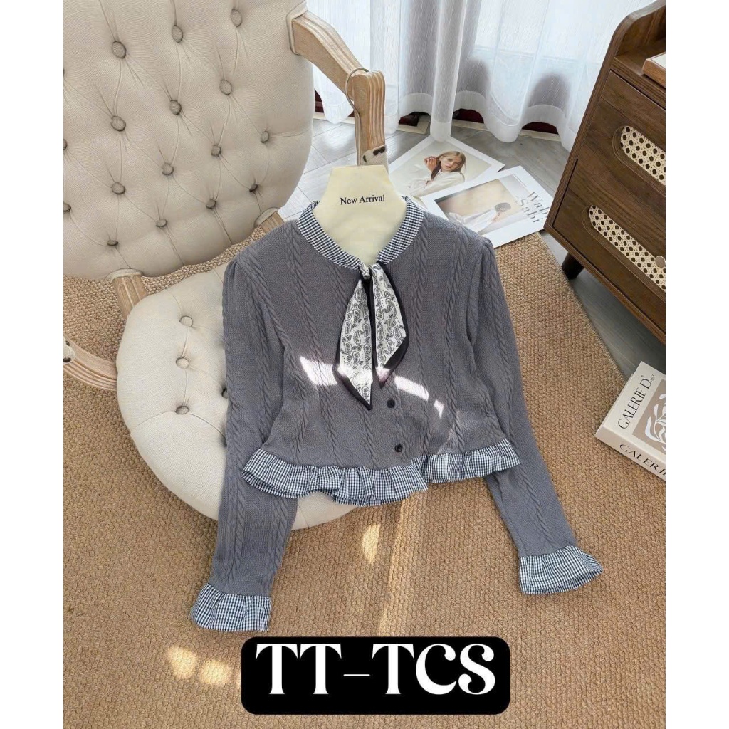 Áo Len Nữ Dài Tay Hàn Quốc, Áo Len Cổ Ngọc Phối Viền Kẻ Buộc Nơ Viền Tay Bèo Tiểu Thư Freesize HQA4