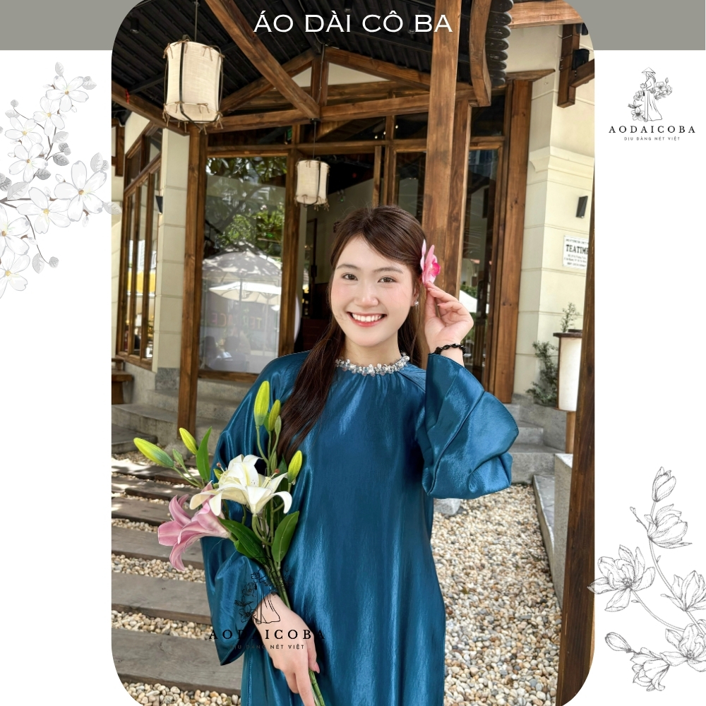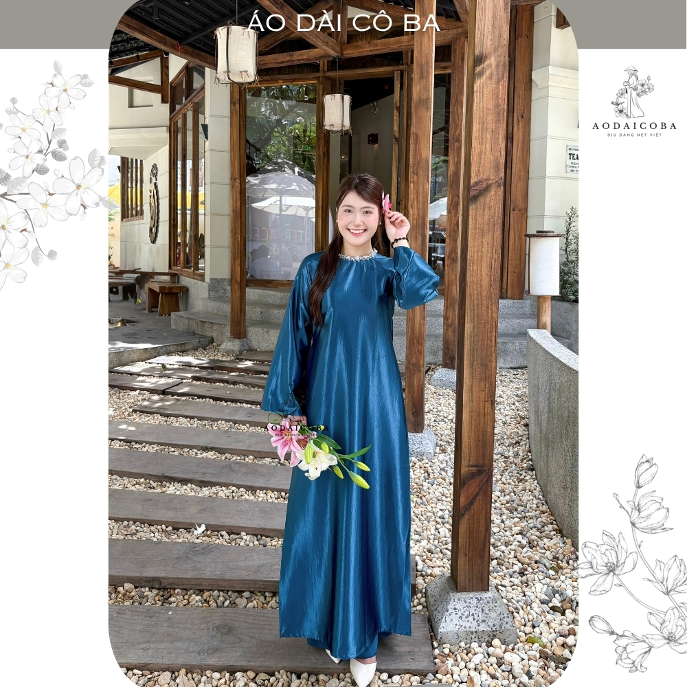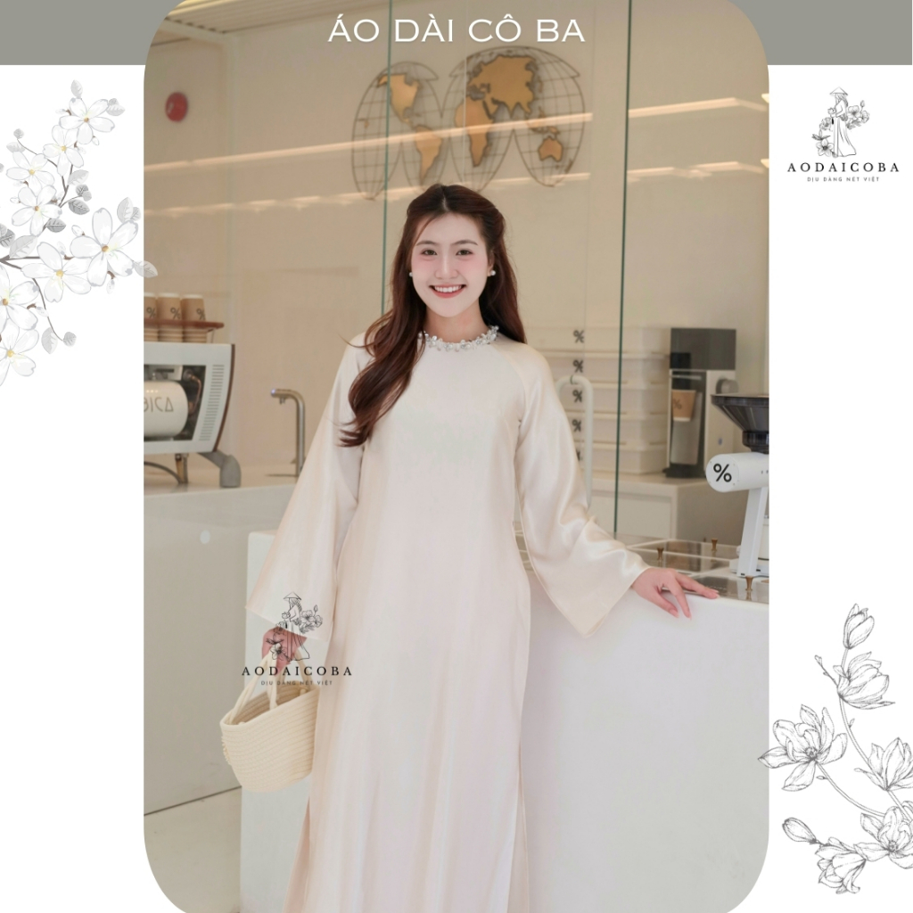 Áo Dài Cách Tân Nữ Dáng Suông Cổ Tròn Mộng Giao Lụa Tráng Gương Mịn, Tay Dài Loe Rộng Sang Trọng, Cổ Kết Ngọc Trai