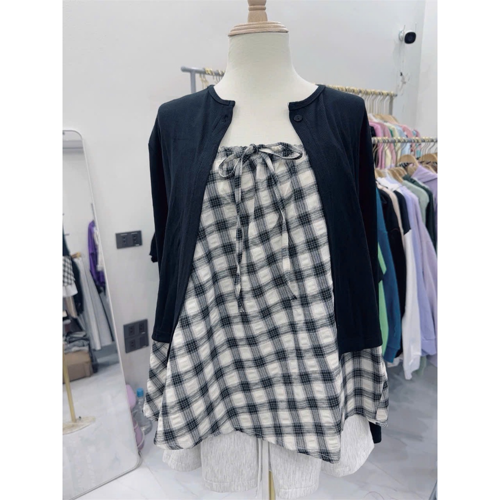 Set áo kẻ gồm áo 2 dây buộc nơ kèm áo khoác ngoài (áo kẻ chất thô,áo khoác ngoài chất thun mềm mịn)
