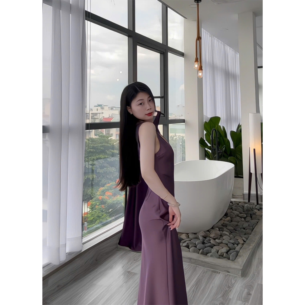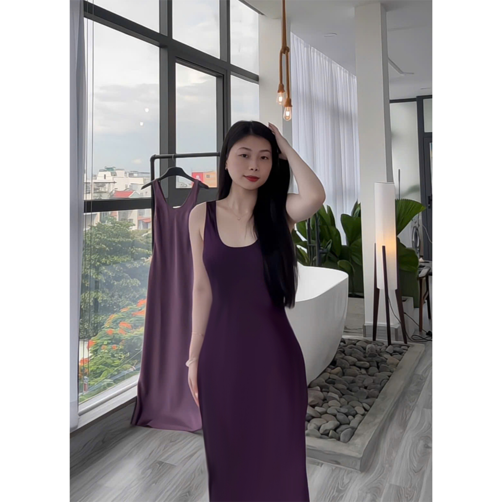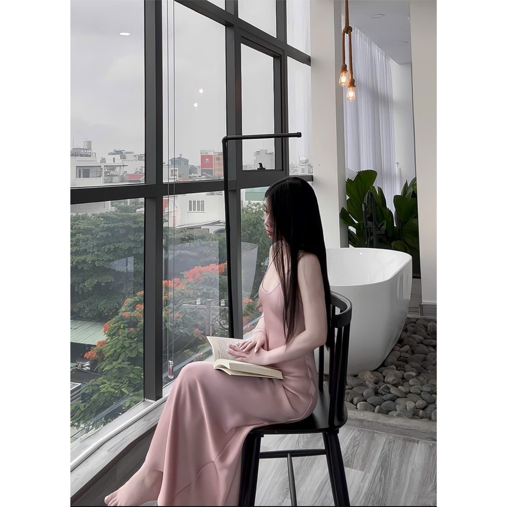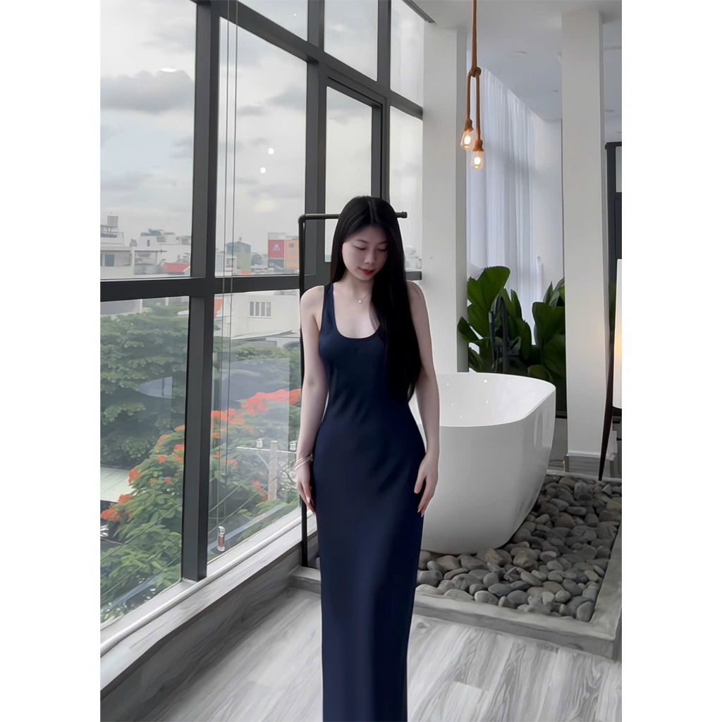 Đầm Lụa Cổ U Dây Mảnh Form Dài,Váy Lụa Hàn Châu 1 Lớp Không Mút,Không Dây Kéo Tôn Dáng