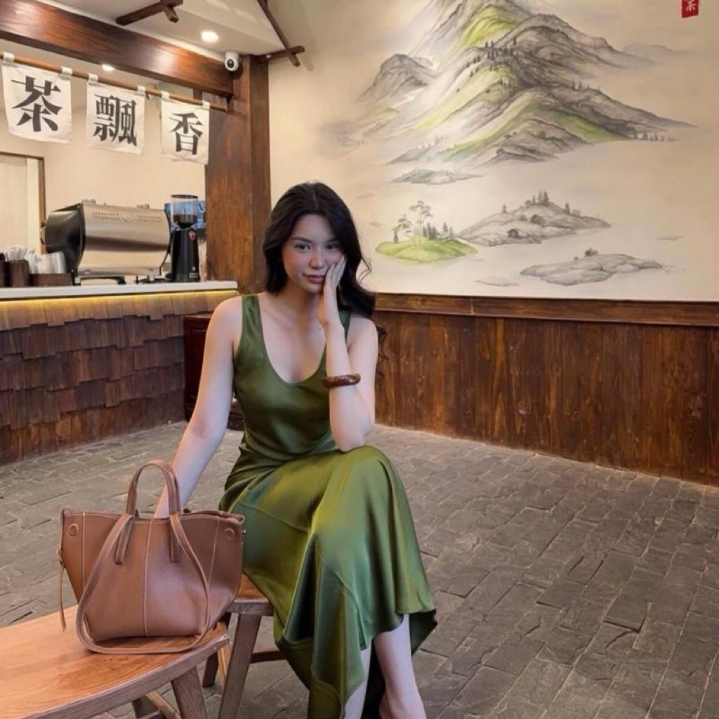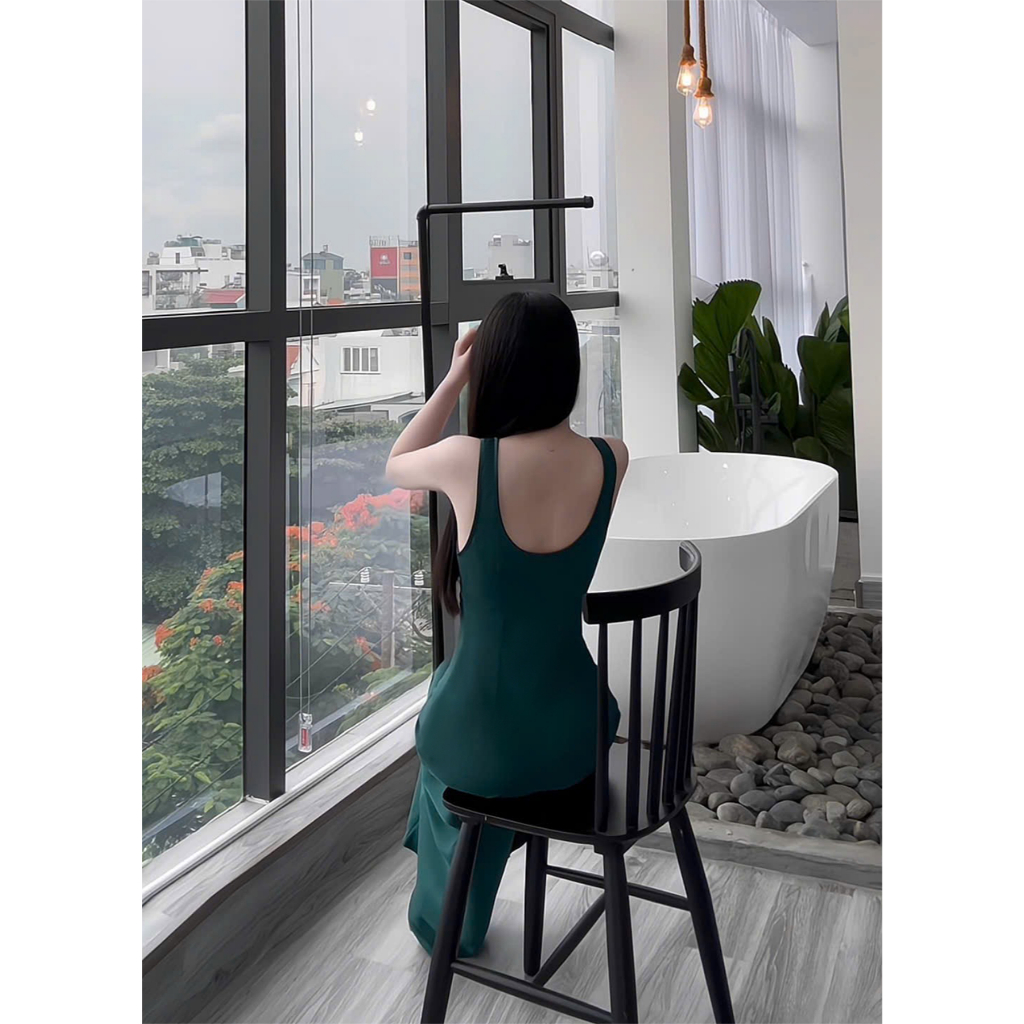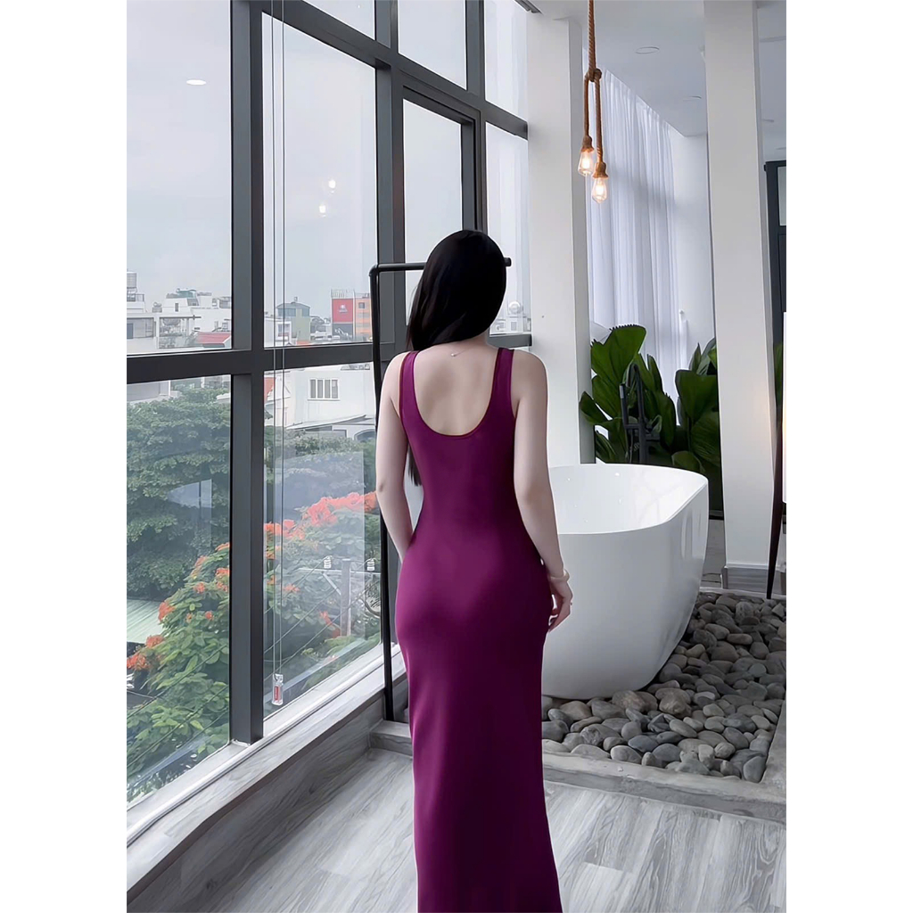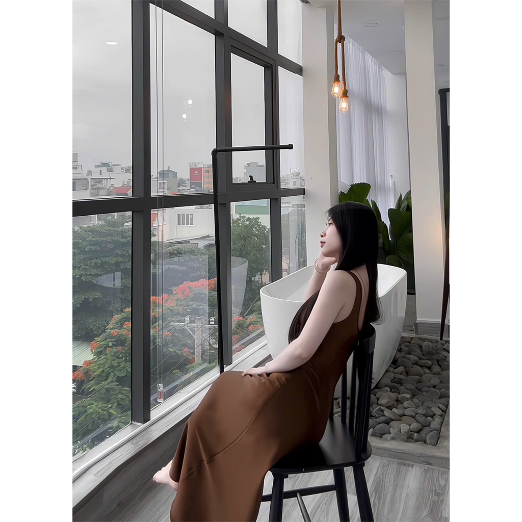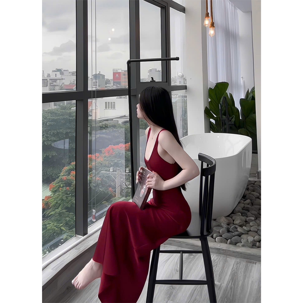 Đầm Lụa Cổ U Dây Mảnh Form Dài,Váy Lụa Hàn Châu 1 Lớp Không Mút,Không Dây Kéo Tôn Dáng