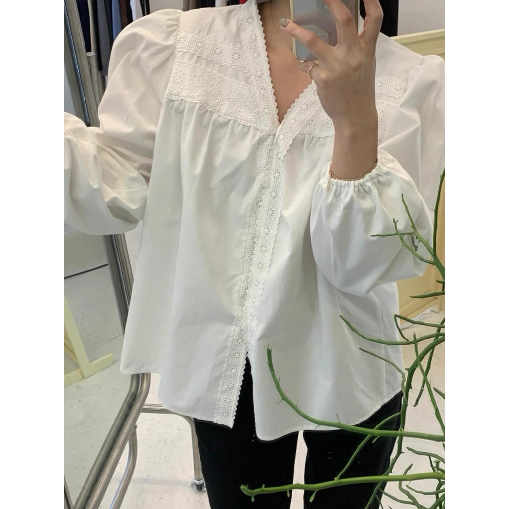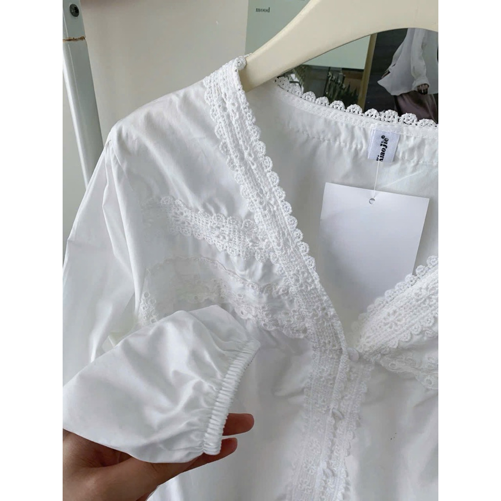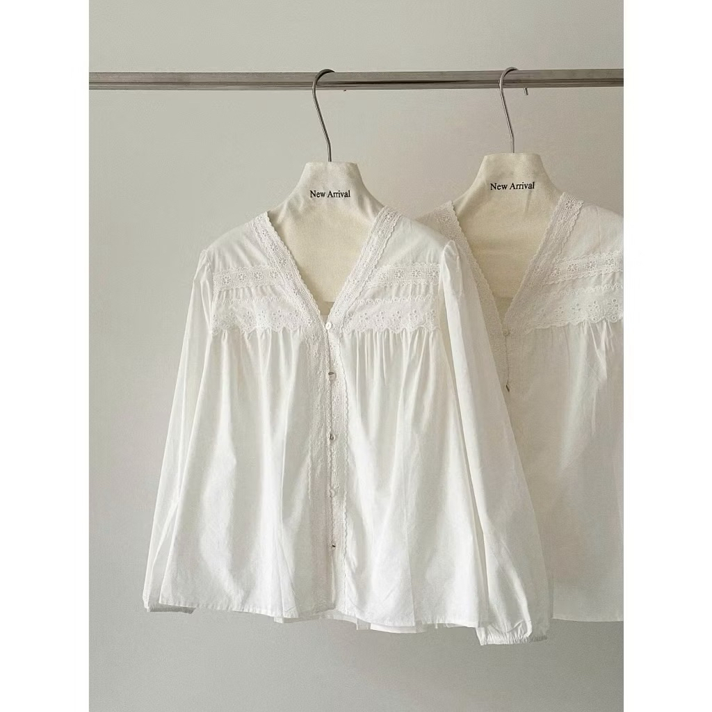 Áo sơ mi nữ tay dài chất thô boi cổ V viền ren cách điệu hàng chuẩn QC - AL2508