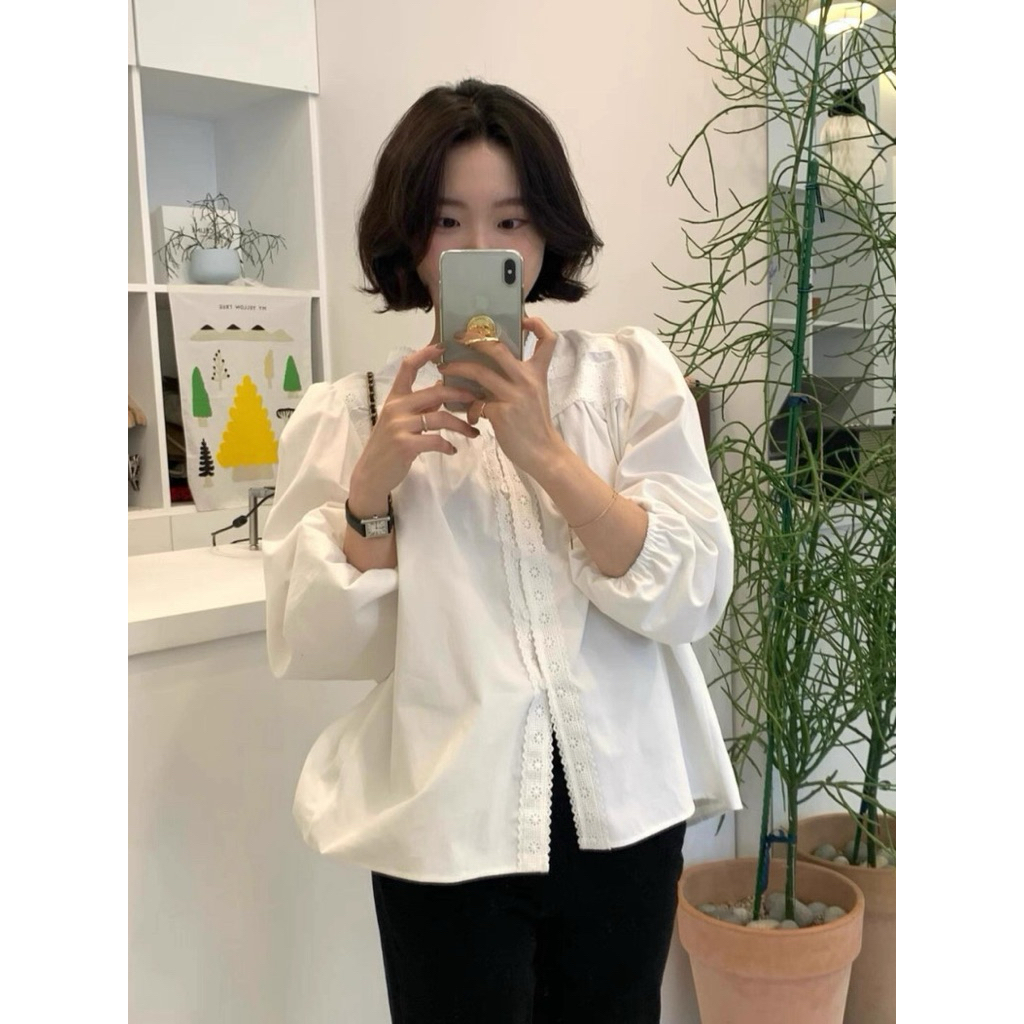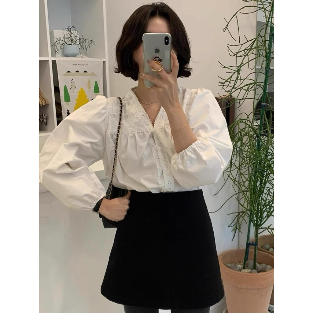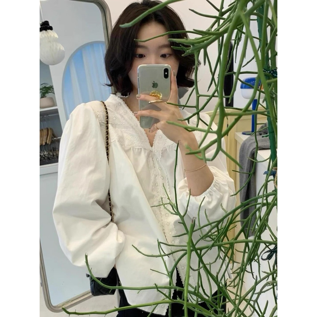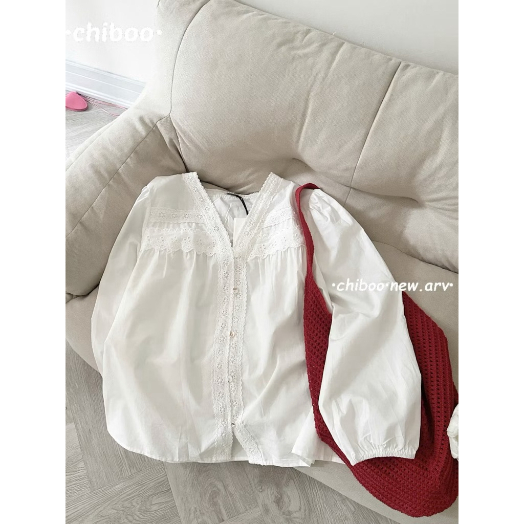 Áo sơ mi nữ tay dài chất thô boi cổ V viền ren cách điệu hàng chuẩn QC - AL2508