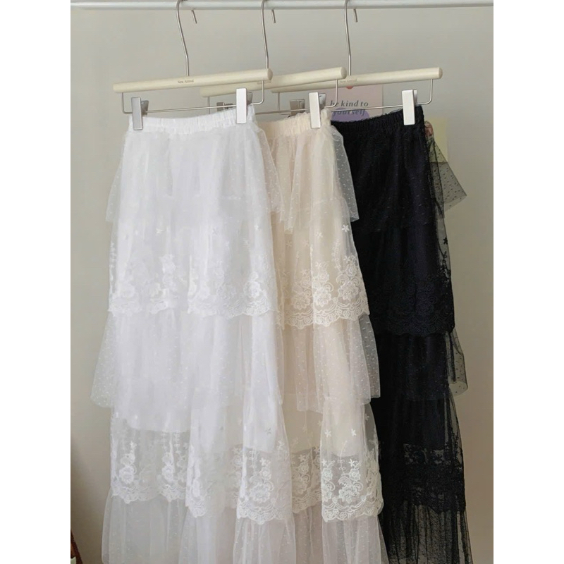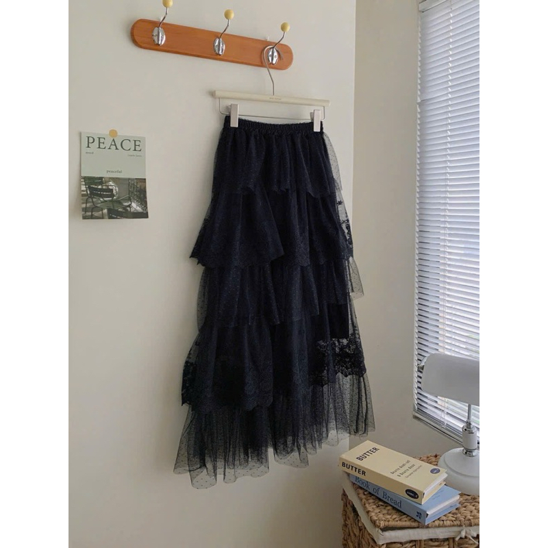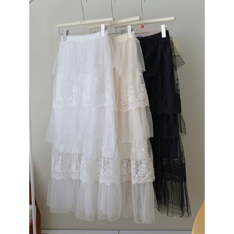Chân váy midi nhiều tầng phối ren hoa lưới cạp chun Ulzzang