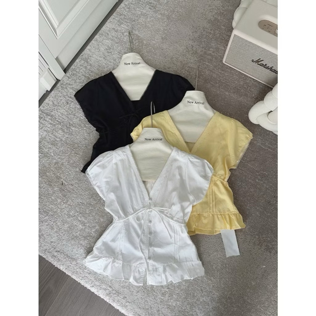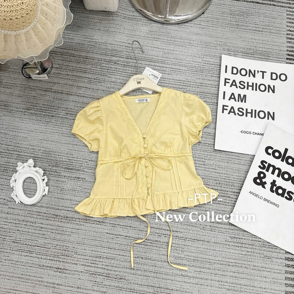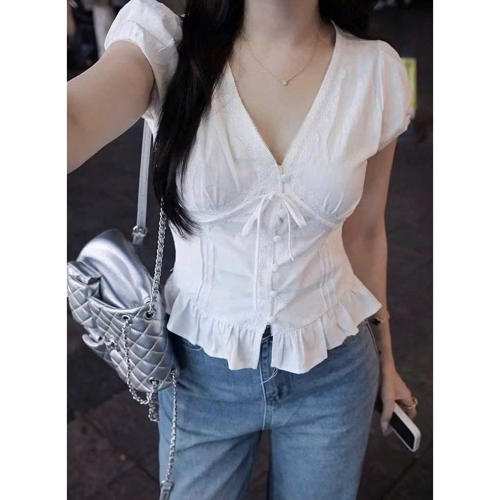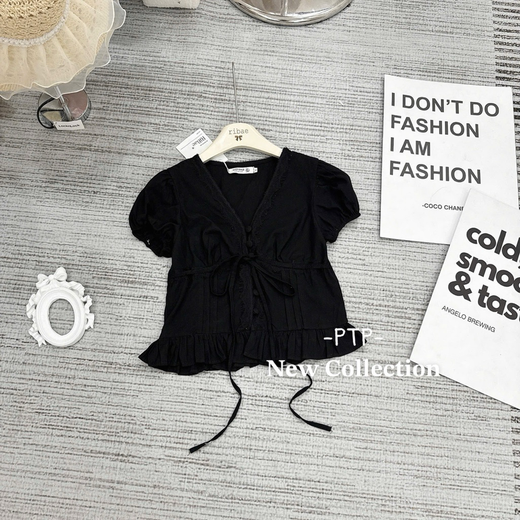 Áo Sơ Mi Kiểu Nữ Cổ V Phối Viền Ren Cúc Bọc Thắt Nơ 3 Màu Siêu Xinh PTP