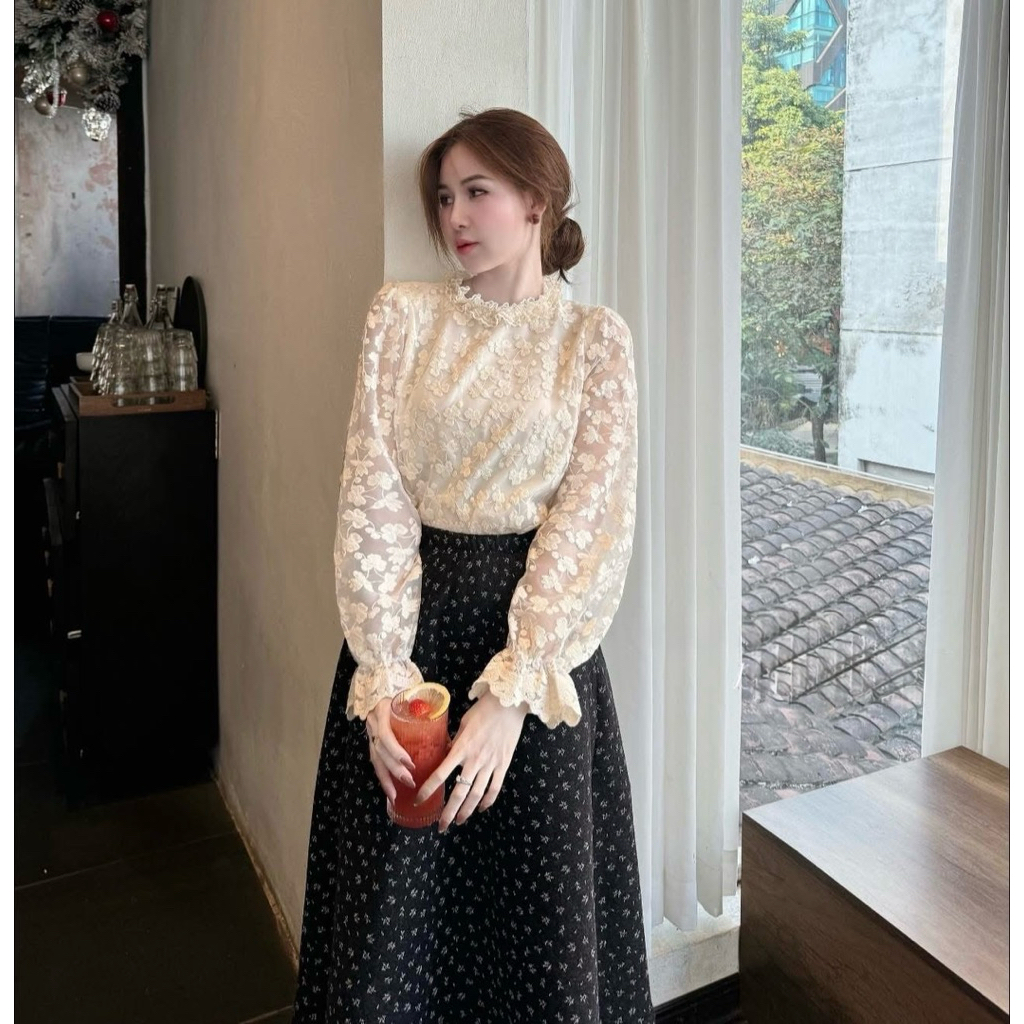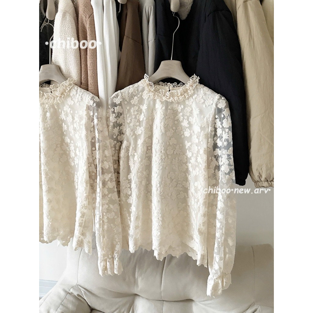 [Hàng Chuẩn L1] Áo sơ mi ren hoa nổi 2 lớp cổ viền bèo tay dài bo chun phong cách tiểu thư siêu xinh A2595