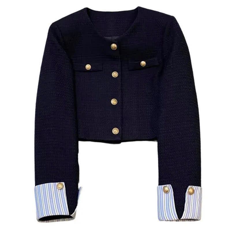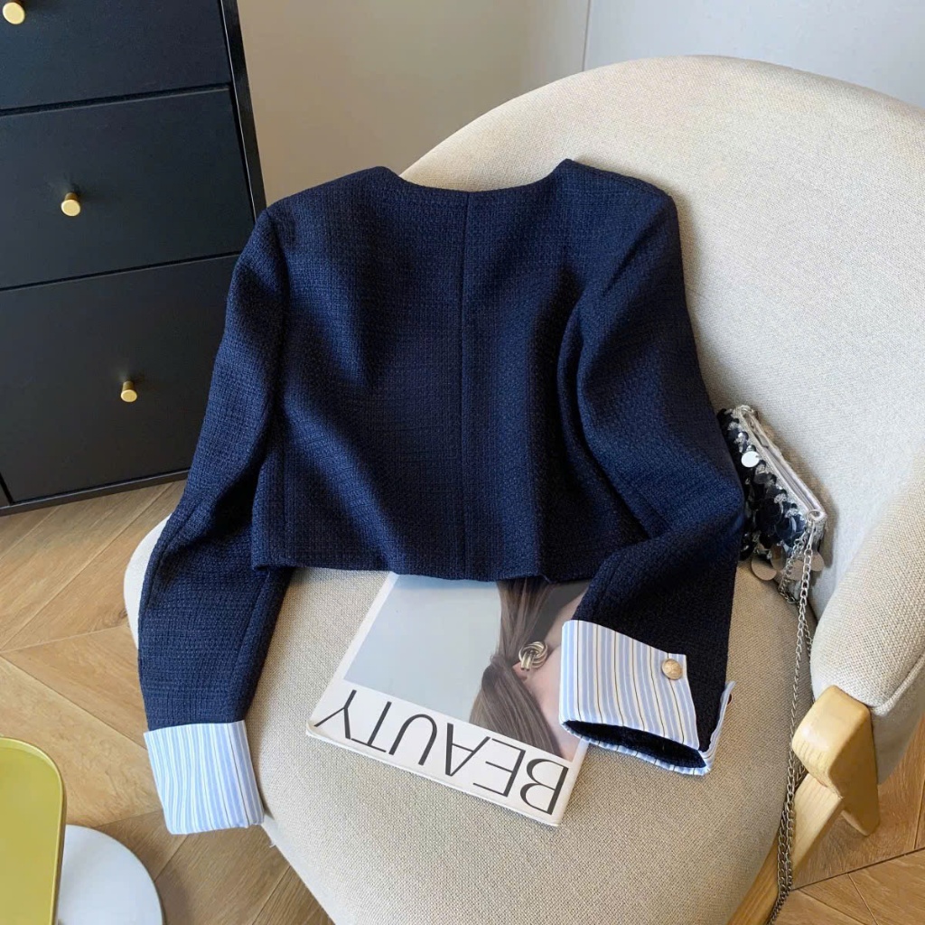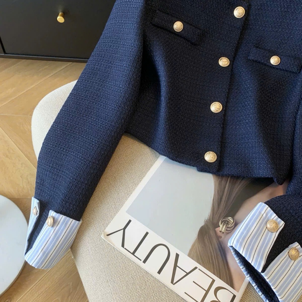 Áo Khoác Nữ Dạ Tweed Dáng Lửng Hàn Quốc - Cổ Tròn Tay Phối Sơ Mi 𝐁𝐲 𝐇ạ 𝐂𝐡𝐢