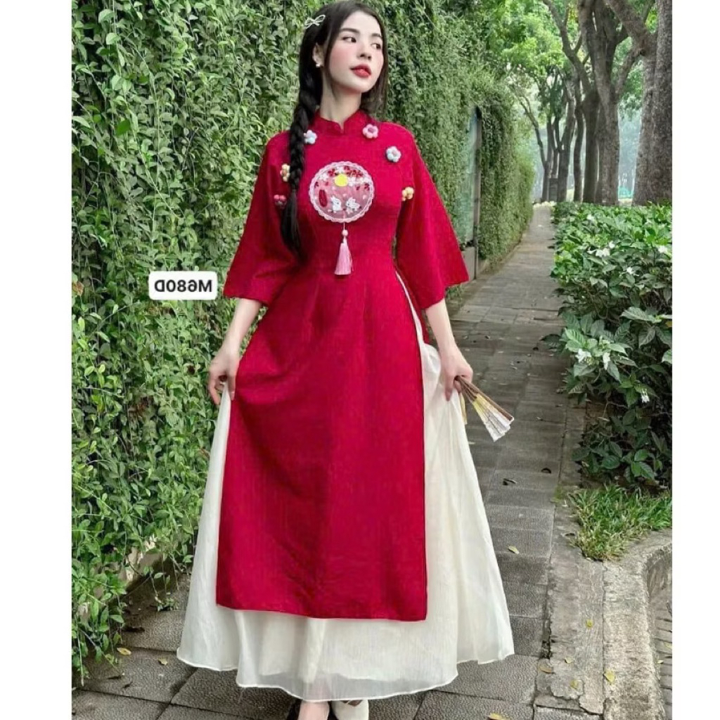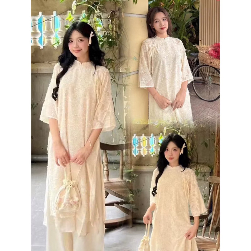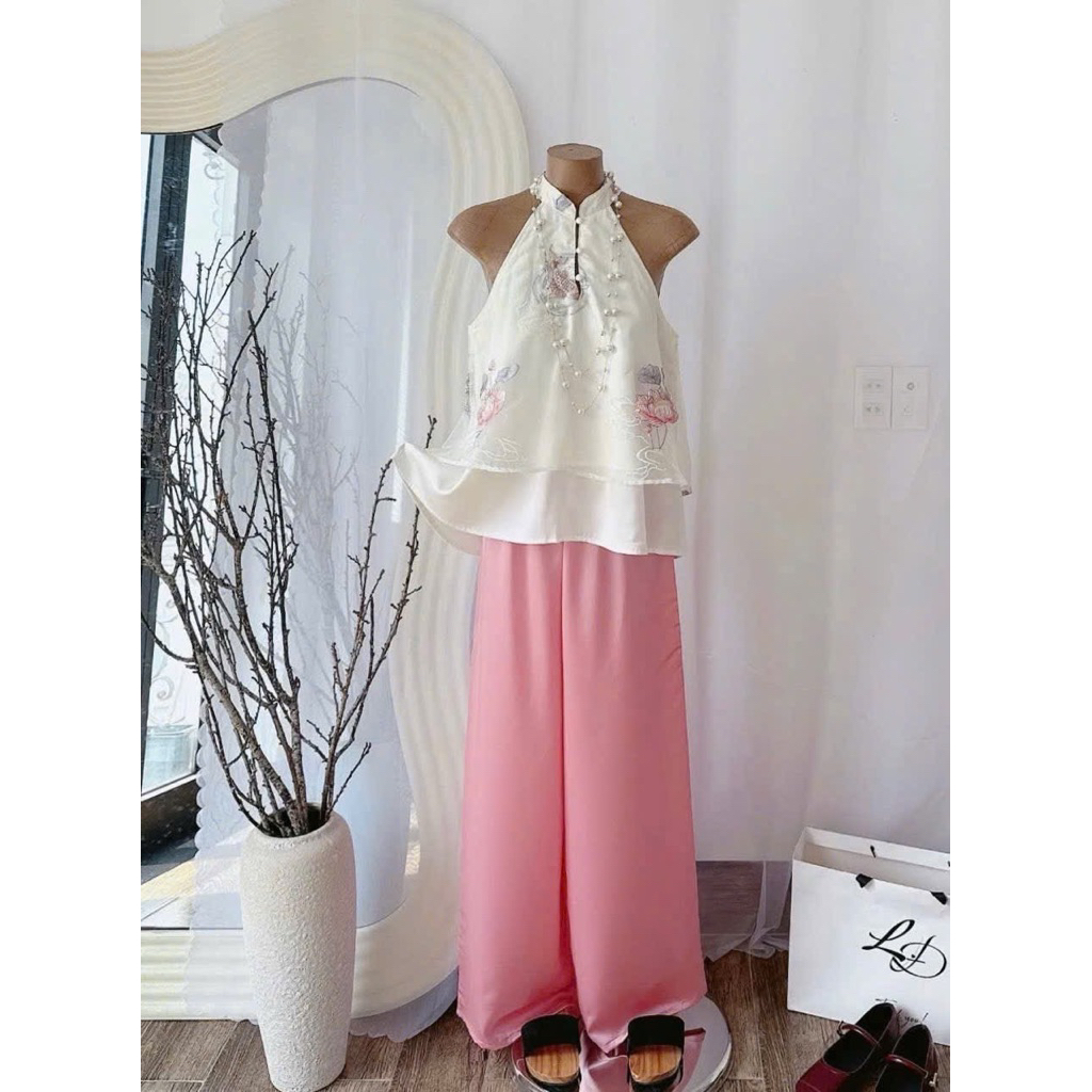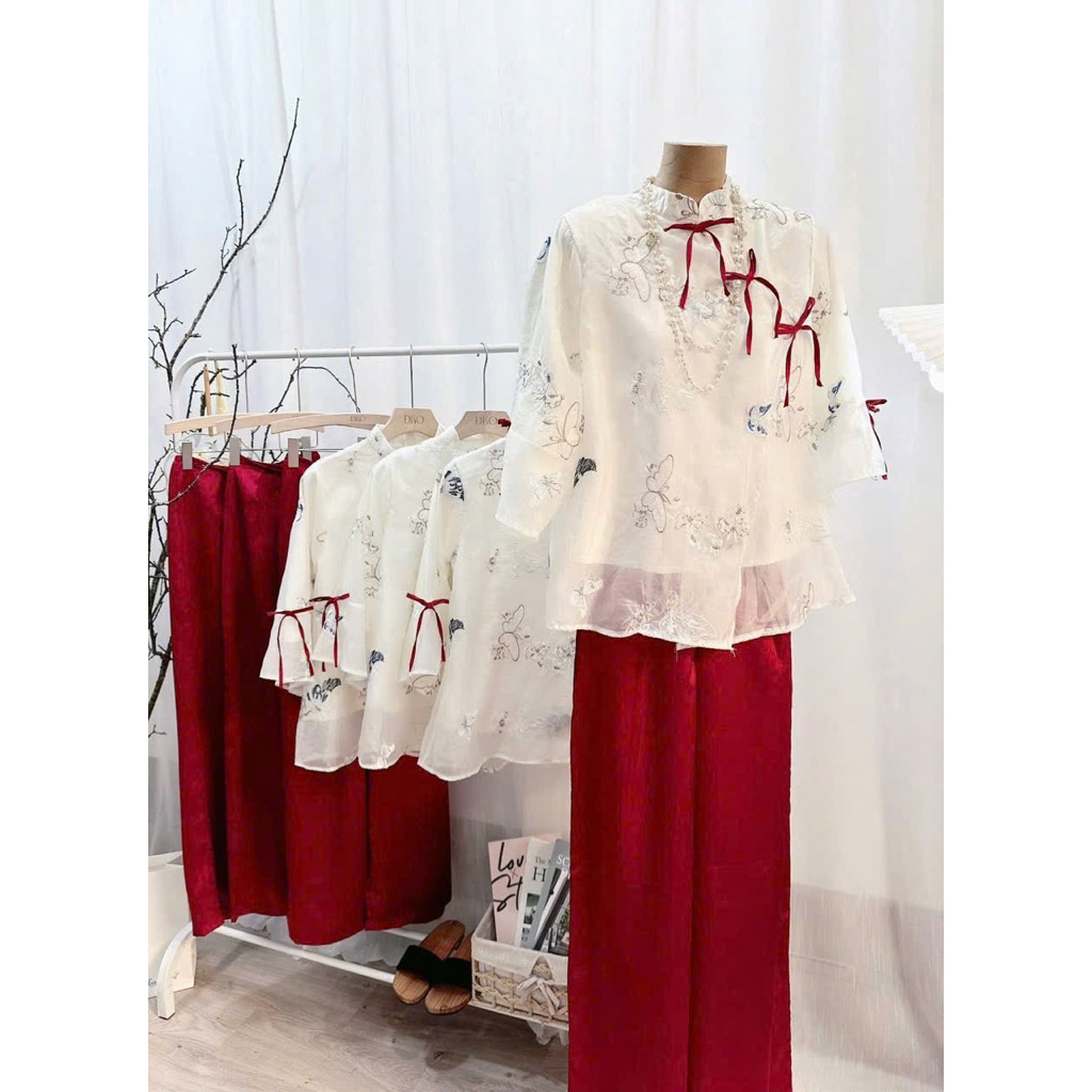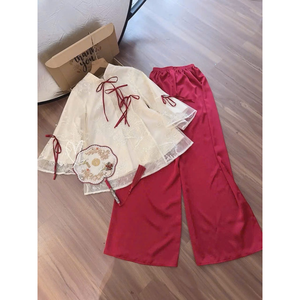 JG5 - (HOẢ TỐC ) Sét bộ lam Tết, áo lam tơ thêu 2 lớp from suông đính nơ mix quần suông trơn ống rộng m (38-58kg)