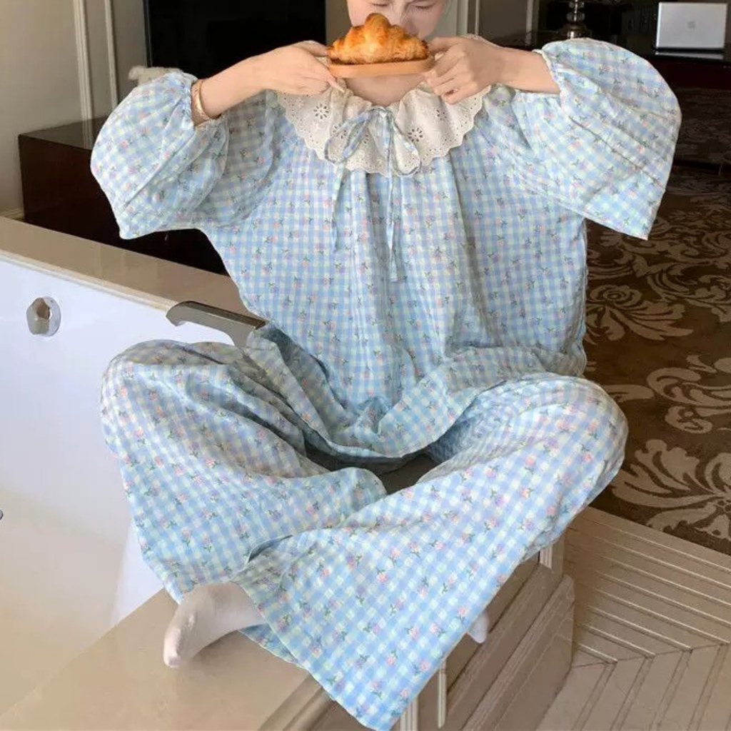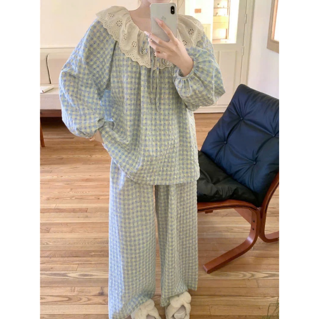 Bộ Đồ Ngủ Pijama Kiểu Nữ Kẻ Caro Mặc Nhà Mùa Hè Thắt Nơ Xinh Xắn Áo Tay Dài Quần Dài - Pink