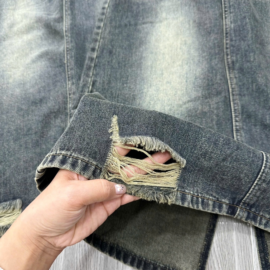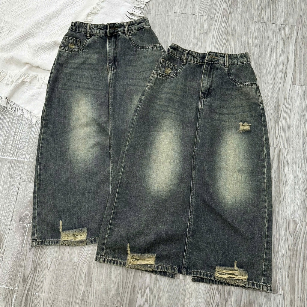 [BIGSIZE 80KG] 3133 Chân Váy Jean Nữ Dáng Dài Rách Gấu Túi Sau Chữ Tua Rua, chân váy bò xẻ sau
