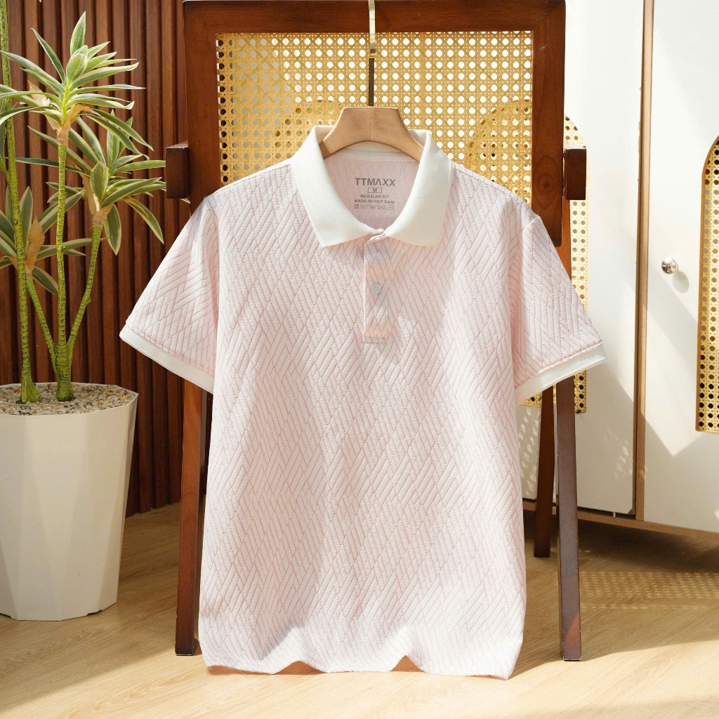 TTMAXX Polo Nam Dệt Họa Tiết Diamond Bo Dệt Sọc Gân Nhẹ Nhàng Thanh Lịch Thiết Kế Xẻ Lai Áo Form Reguler Fit Co Giãn