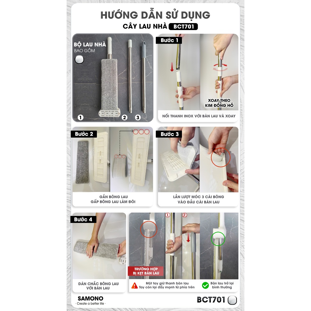 SAMONO Cây Lau Nhà Tự Vắt Thông Minh Bonbox BCT701 Đầu Xoay 360 Độ Linh Hoạt, Chổi Lau Nhà Tự Vắt Lau Sạch Mọi Góc