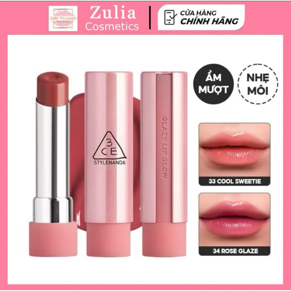 Son Bóng Dưỡng Môi 3CE Glazy Lip Glow Dạng Thỏi Có Màu, Hàn Quốc