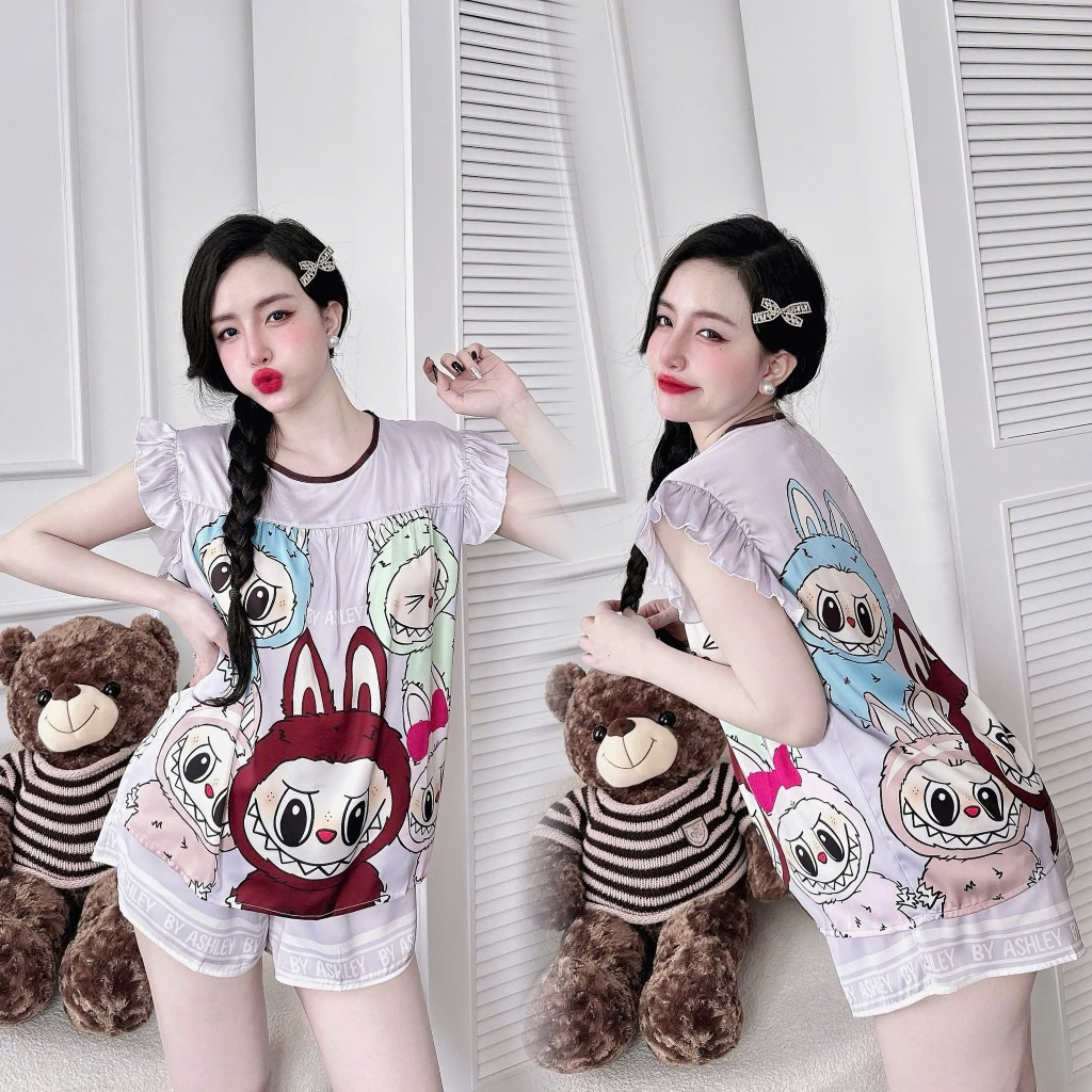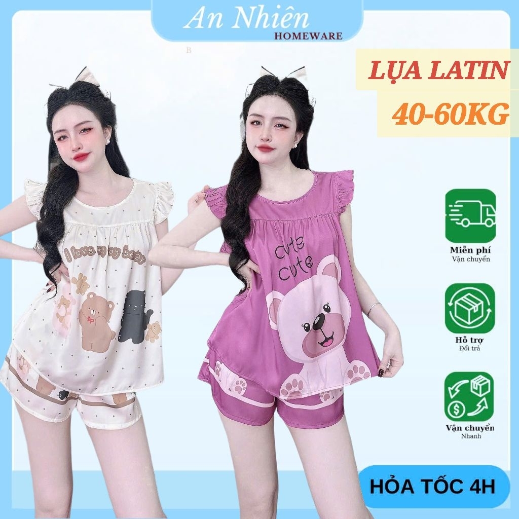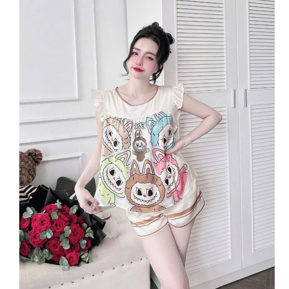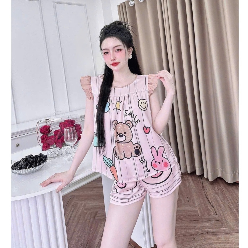 [Freesize 40-60kg] Bộ đồ ngủ tay cánh tiên cổ tròn quần đùi lụa Latin mềm mịn mát họa tiết dễ thương