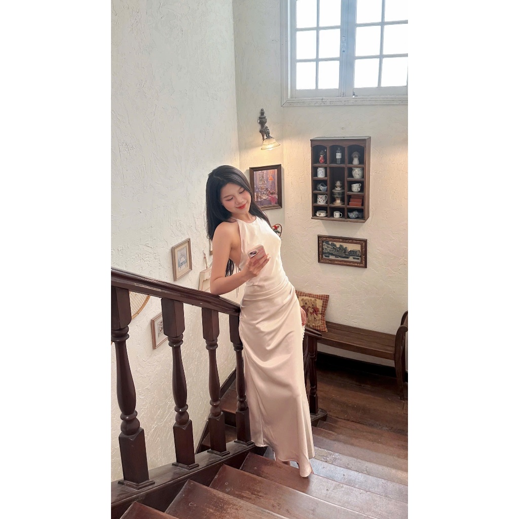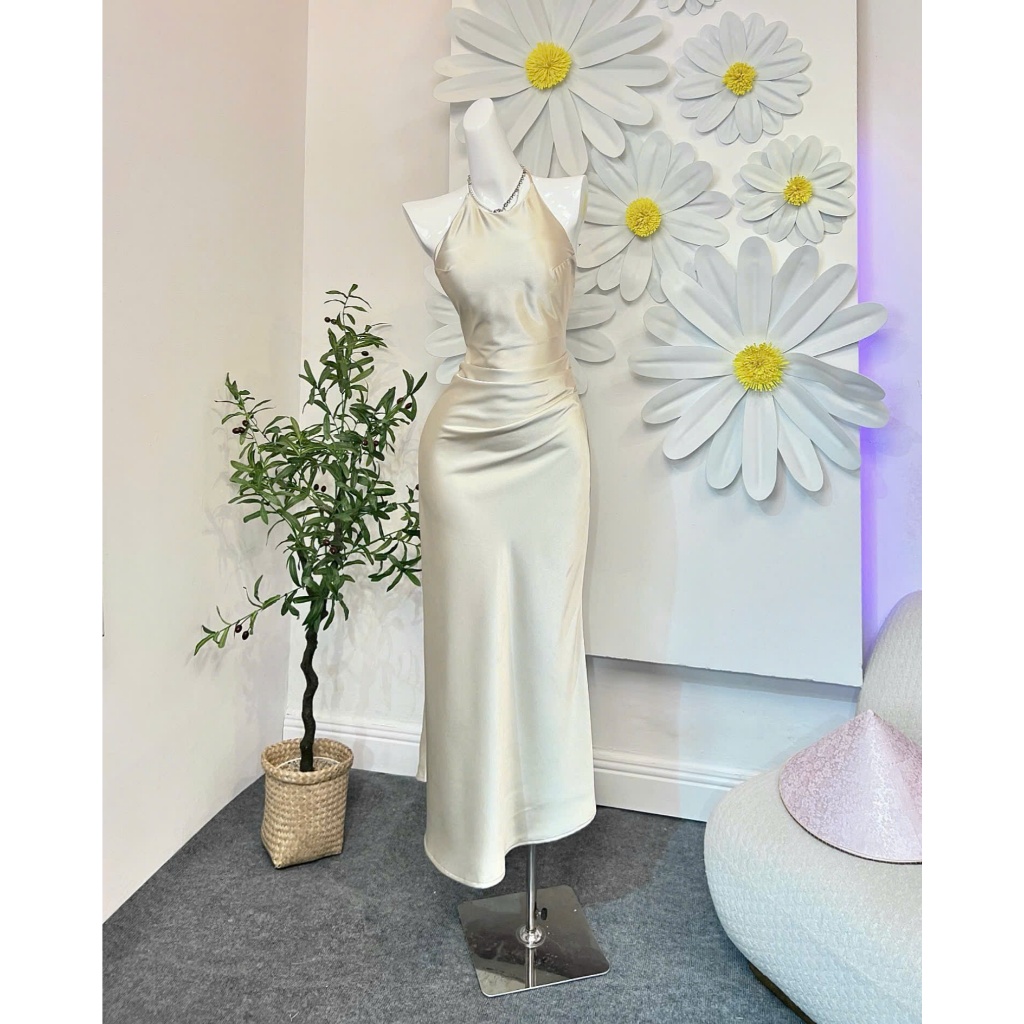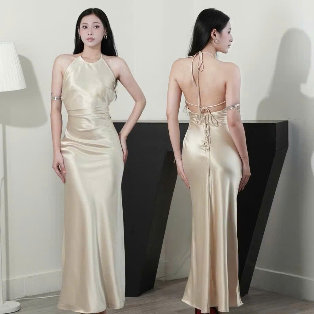 P245 - Đầm lụa midi cổ yếm hở lưng nhún eo xếp ly có mút đi tiệc đi chơi mẫu mới 2025