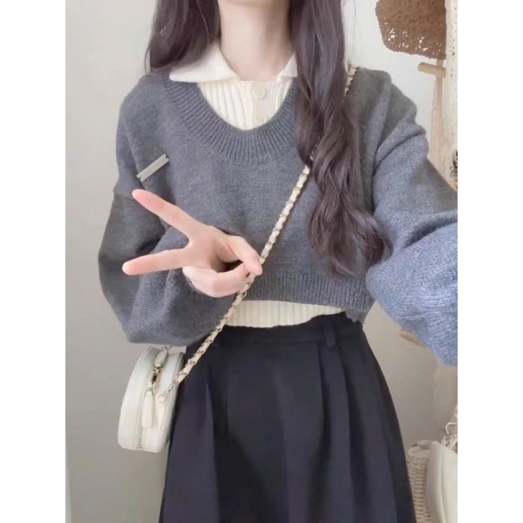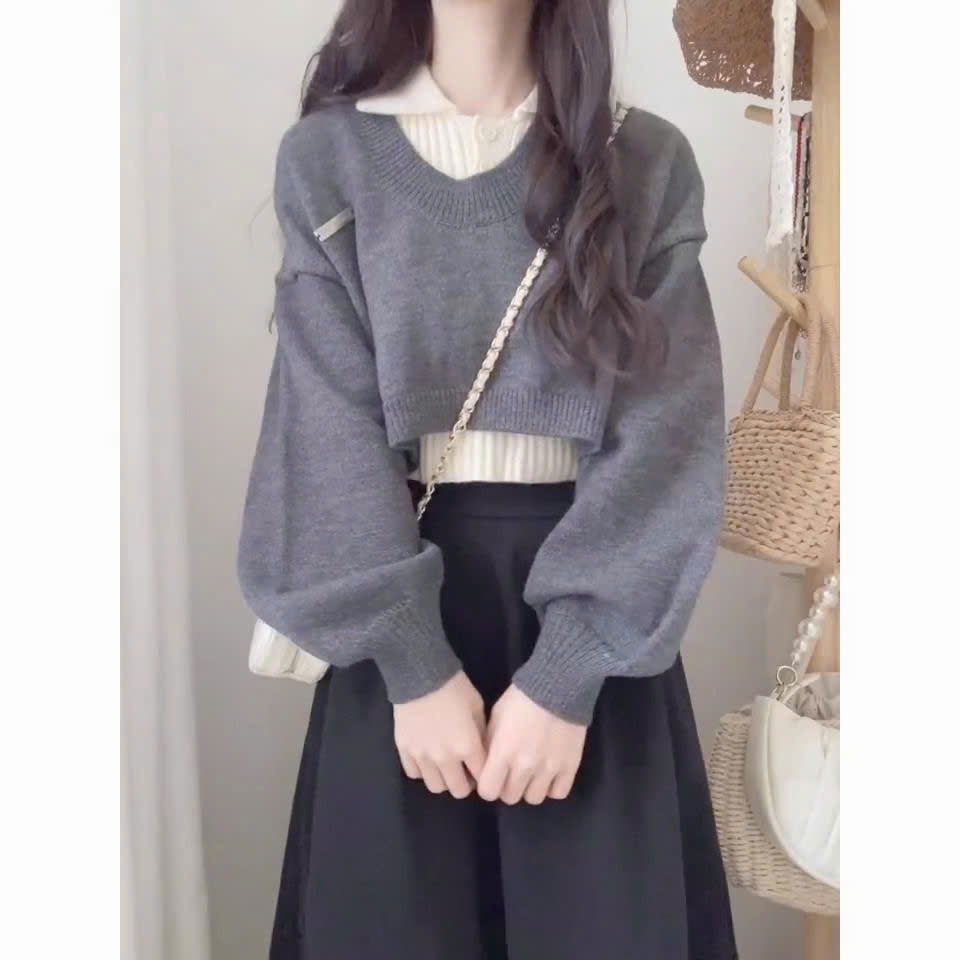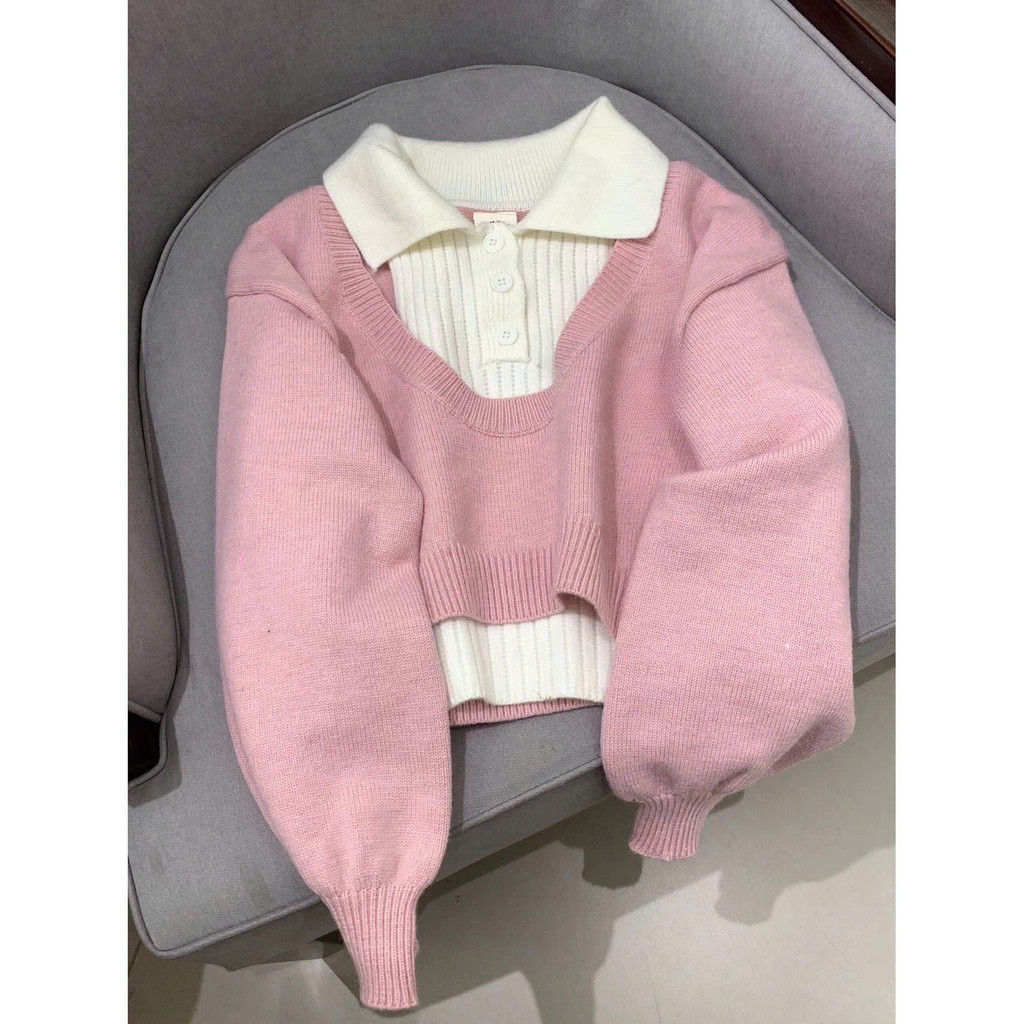 Áo len thu đông set 2 món thiết kế cổ sơ mi phối tay bồng hottrend KUNKUN SP242