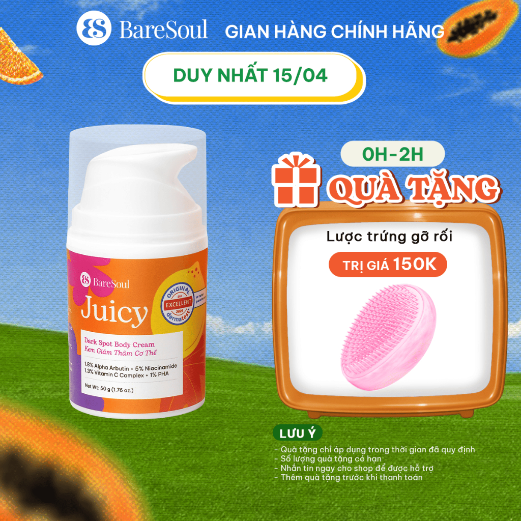 Kem làm sáng, giảm thâm mông, nách, bikini, đầu gối, khuỷu tay với Alpha Aburtin, Niacinamide BareSoul Juicy 50g