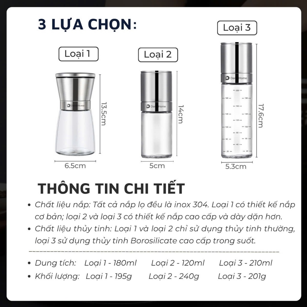 Lọ xay tiêu cầm tay thủy tinh và inox 304 cao cấp DandiHome tiện lợi