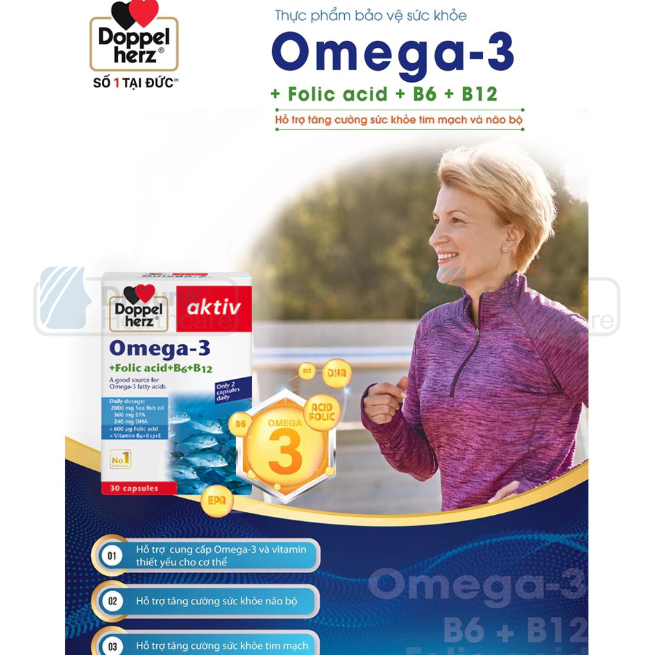 COMBO 2 HỘP Dầu Cá Omega 3 Doppelherz - Bổ Sung Omega 3, Acid Folic, Duy Trì Sức Khỏe Tim Mạch (30V)