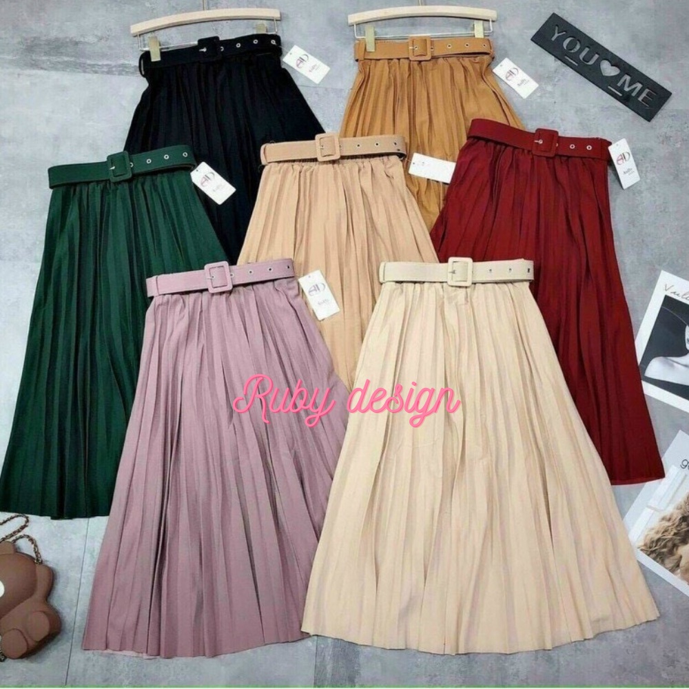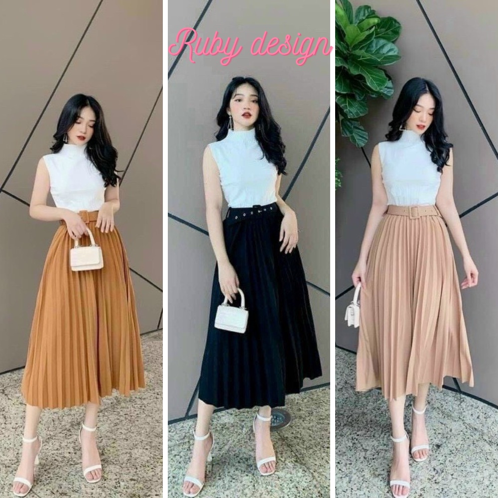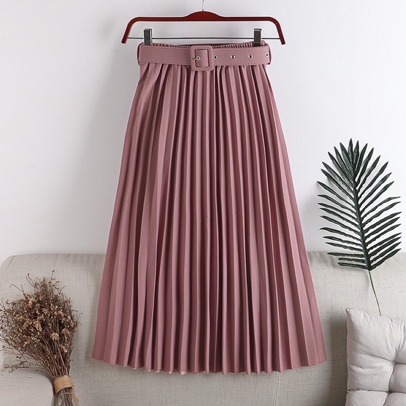 Chân váy xếp ly, chân váy xếp ly dáng dài tiểu thư kèm đai lưng có đục lỗ hàng Quảng Châu cao cấp Loại 1 - Ruby design