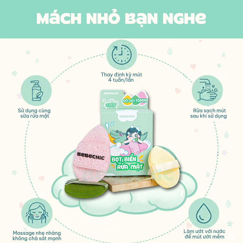 Bông Mút Bọt Biển Rửa Mặt BEBECHIC Mềm Mại, Hỗ Trợ Tạo Bọt, Làm Sạch Da Mặt Hiệu Quả (Hộp 3 Mút)