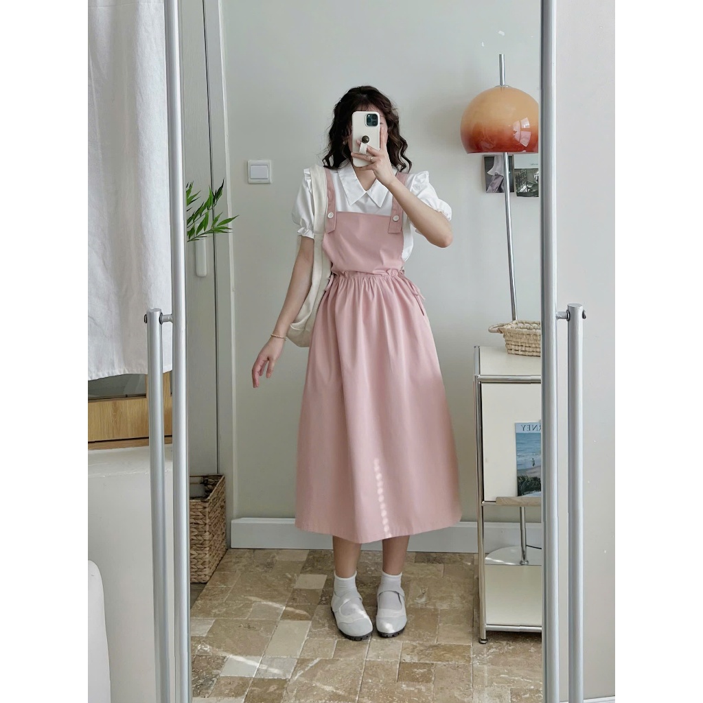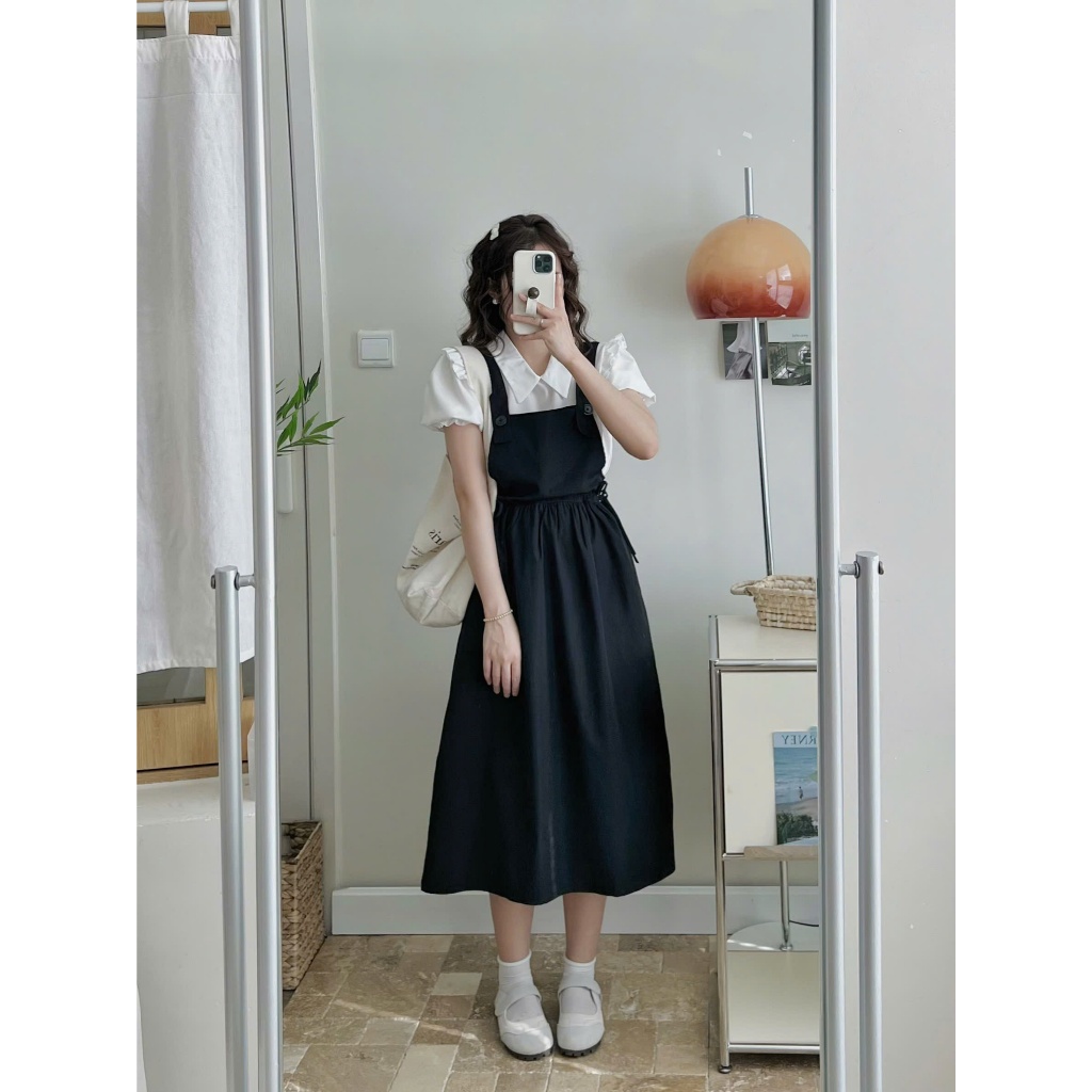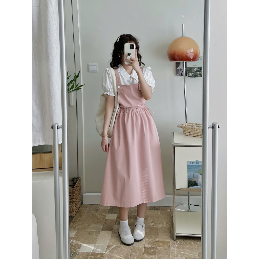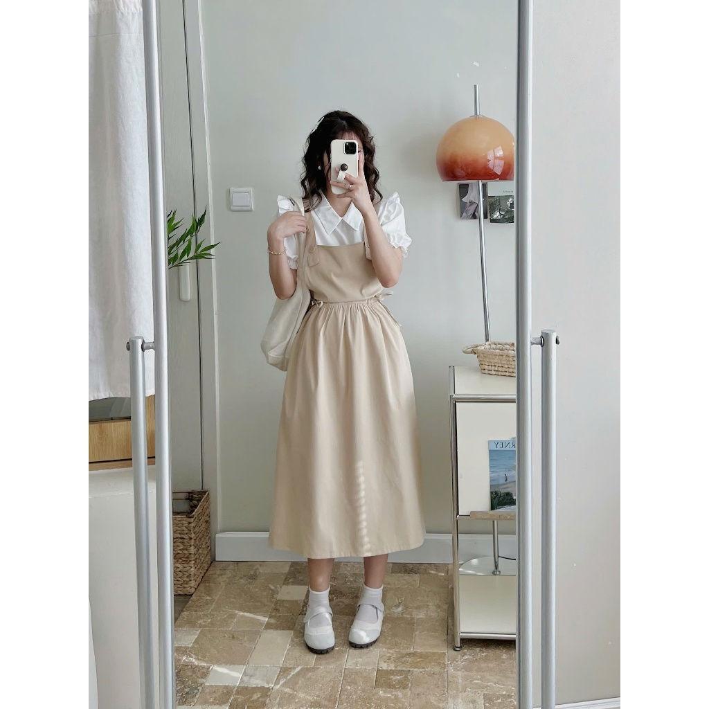 Set váy yếm kate dáng dài màu trơn thắt eo kèm áo sơ mi tay ngắn babydoll, set hai món yếm phối áo tay phồng Ulzzang