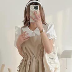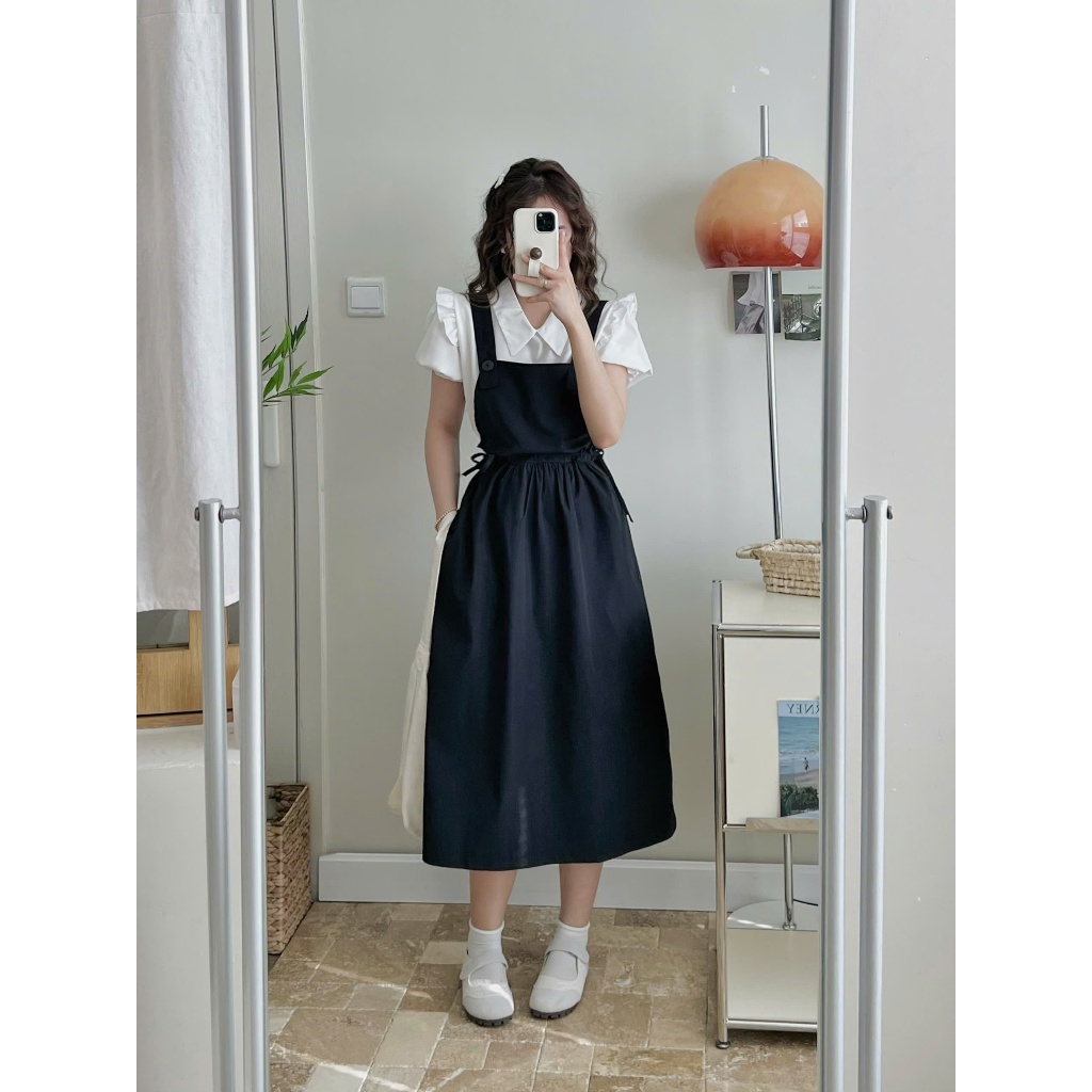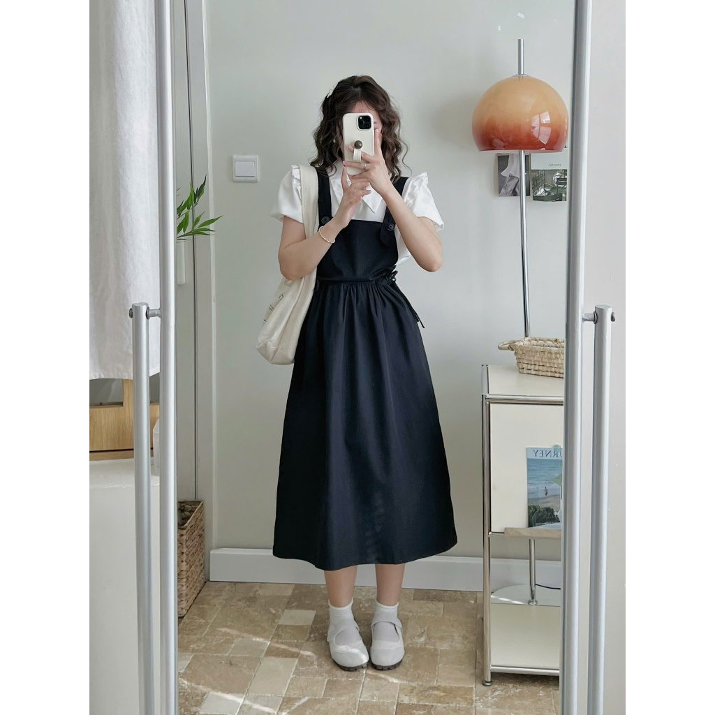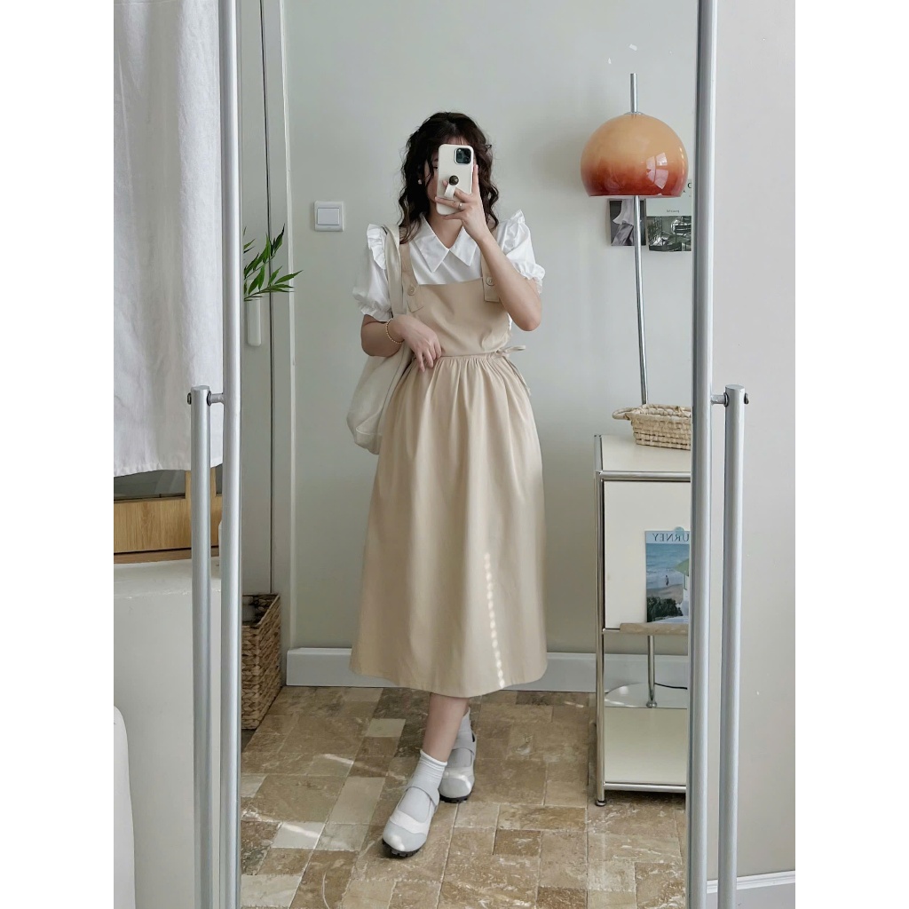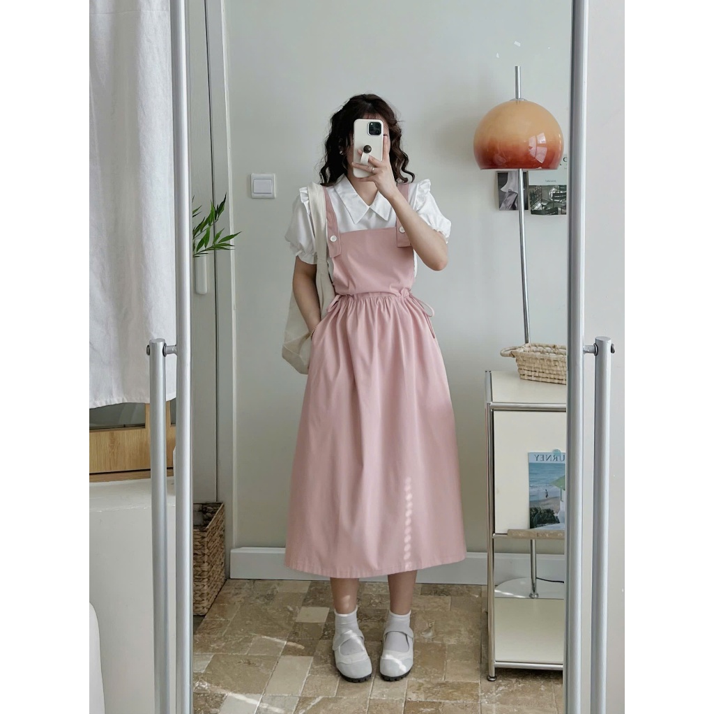 Set váy yếm kate dáng dài màu trơn thắt eo kèm áo sơ mi tay ngắn babydoll, set hai món yếm phối áo tay phồng Ulzzang