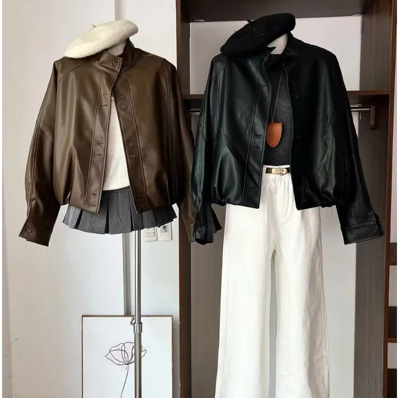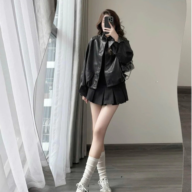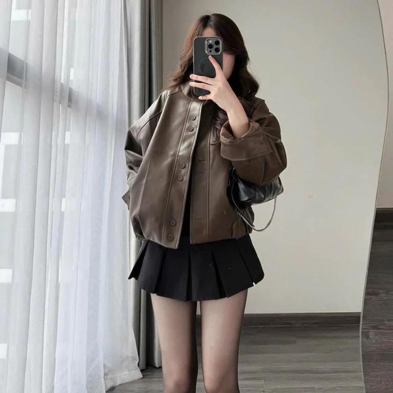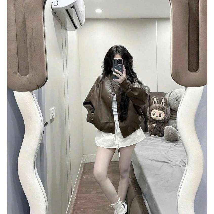 (Mẫu Mới ) Áo khoác da nữ bomber da bo gấu cổ tàu form oversize phù hợp cho mùa thu đông