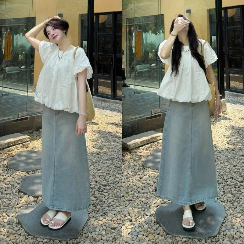 (ẢNH OLDSCHOOL) Chân váy jeans nữ dáng dài form A màu xanh sáng ánh vàng CV7926