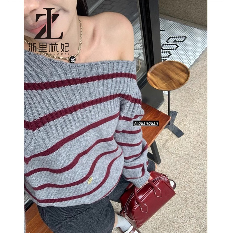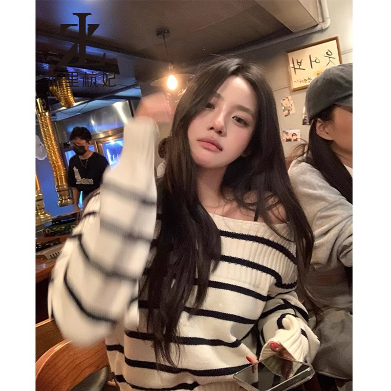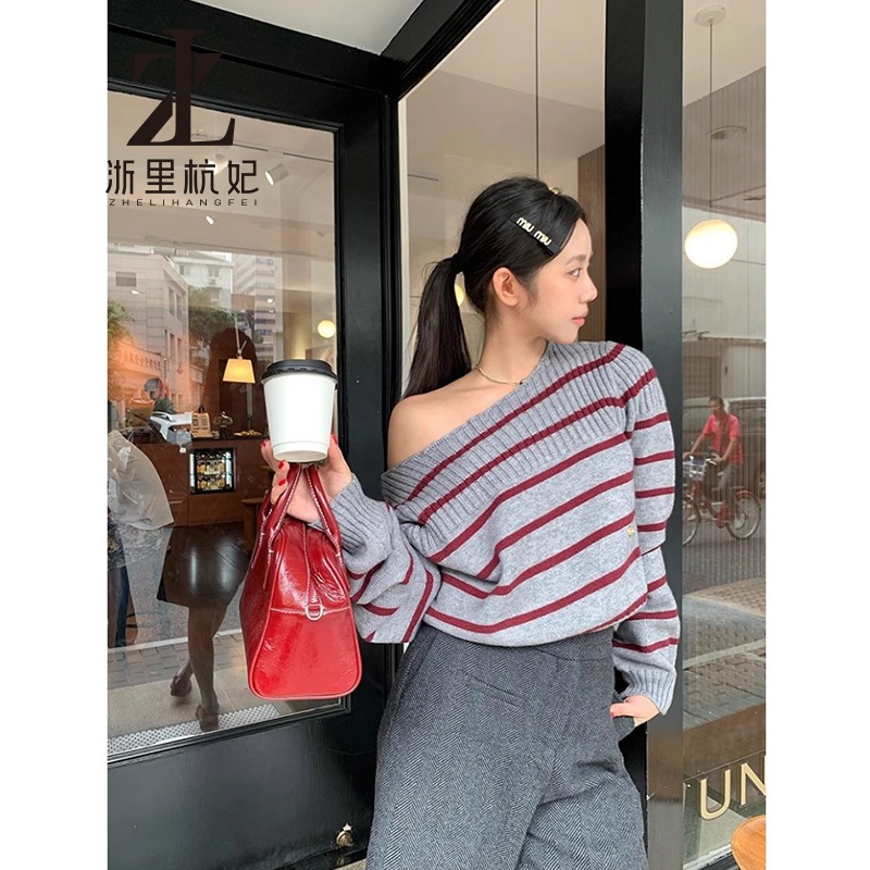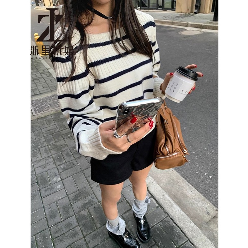 ZHELIHANGFEI Áo cổ rộng ngọt ngào Hàn Quốc với áo len ngắn sọc tương phản