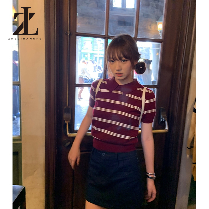 ZHELIHANGFEI Hàn Quốc Nữ Sọc Cổ Polo Dệt Kim Mùa Hè Hàn Quốc Áo Thun Tay Ngắn Rời