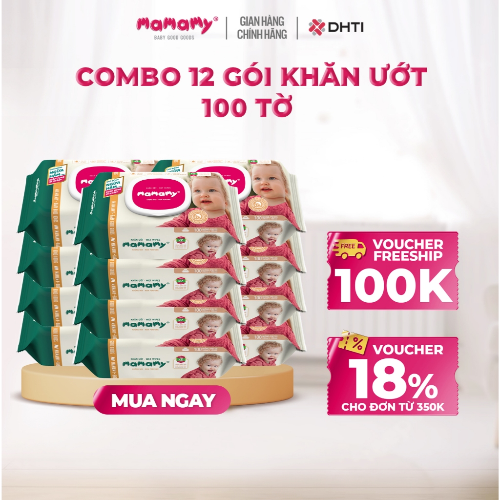 Khăn ướt cao cấp cho bé Mamamy gói 100 tờ gấp đôi ngừa hăm và rôm sẩy, mềm dai sạch sẽ