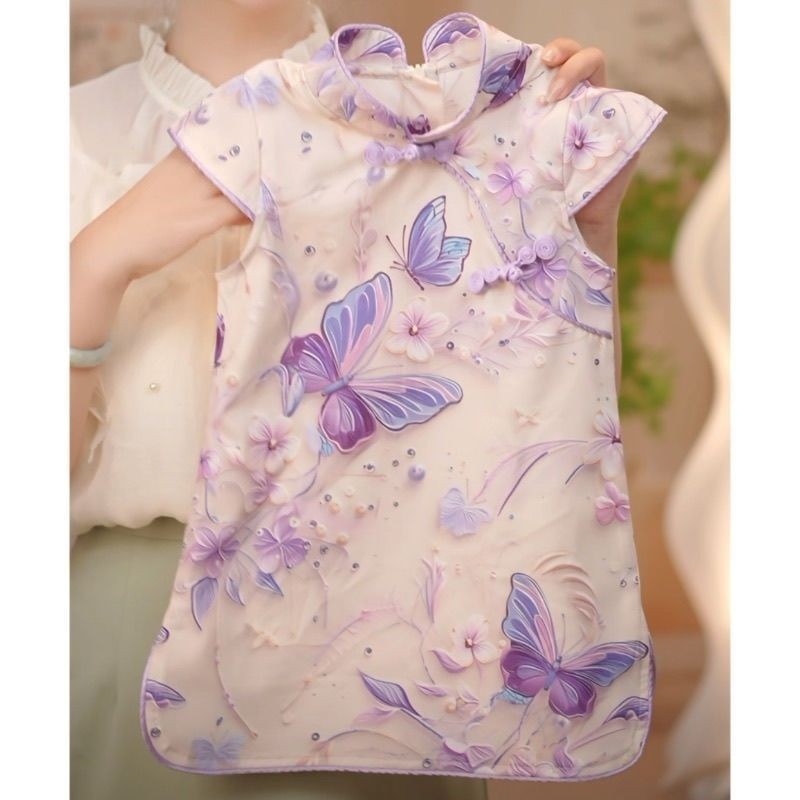 Váy sườn xám cổ điển dành cho trẻ em mùa hè mới bướm in 3D màu tím cải tiến phong cách Trung Quốc mới
