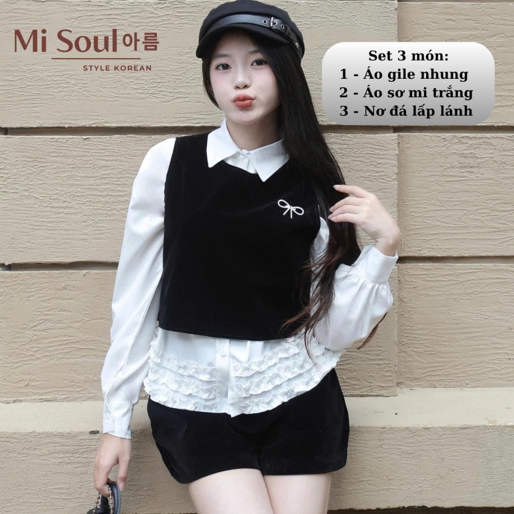 Áo Sơ Mi Tặng Kèm Gile Nhung Tag Nơ Đá Lấp Lánh 496 MiSoul, Sơ Mi Trắng Gấu Bèo Phối Gile Croptop Dáng Babydoll