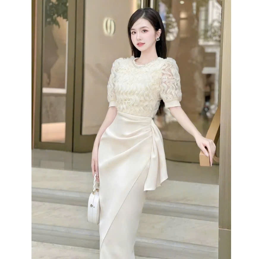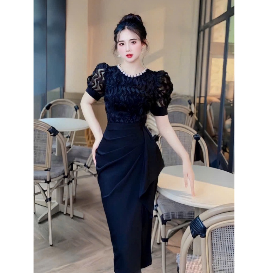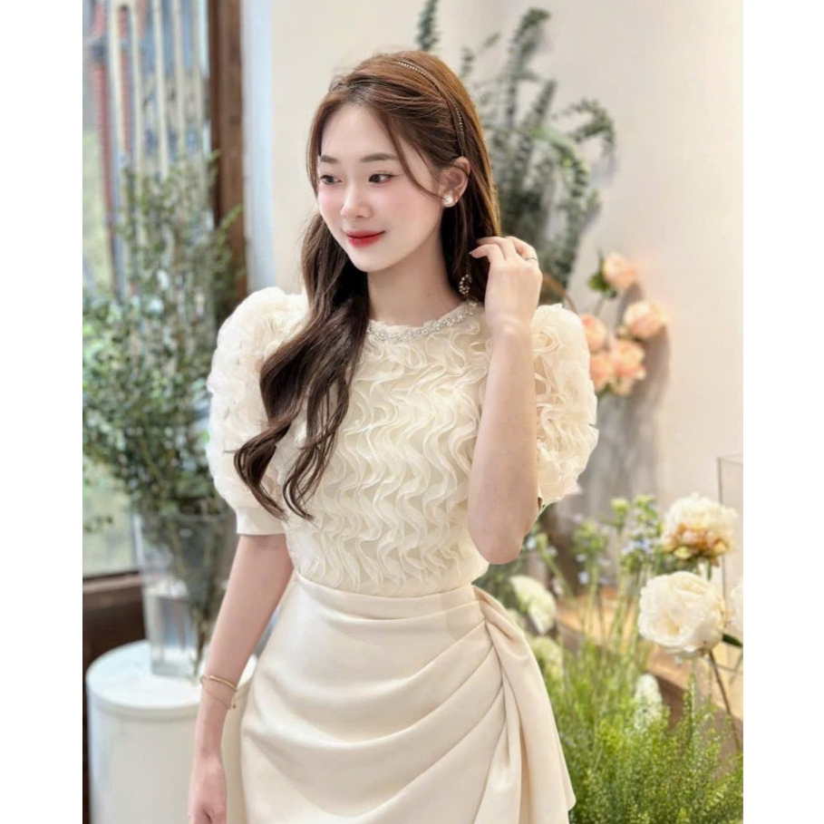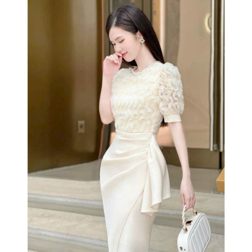 Đầm Nữ Thiết Kế Sang Chảnh Cổ Tròn Đính Đá Tay Bồng Phối Ren Sóng Nổi Dáng Dài Nhún Hông Sang Chảnh Dự Tiệc SP010169