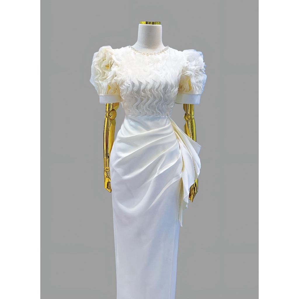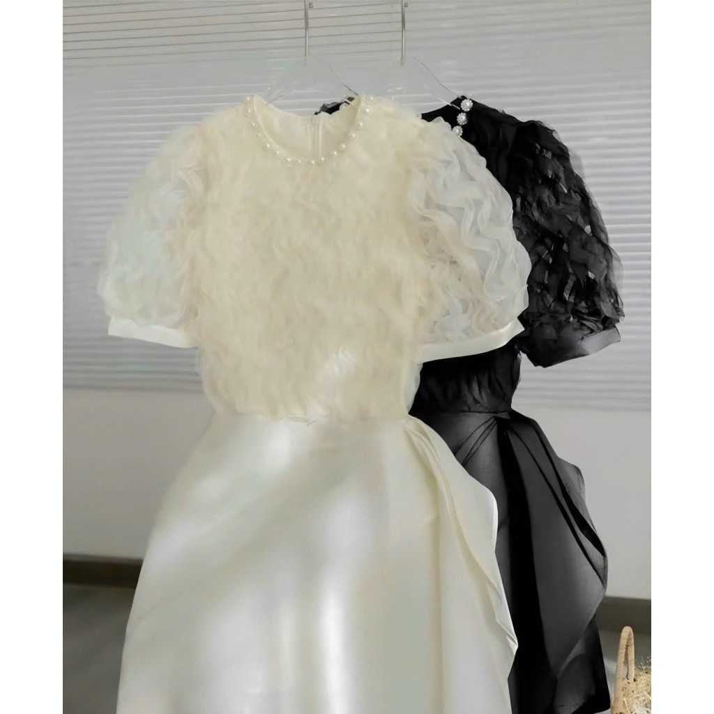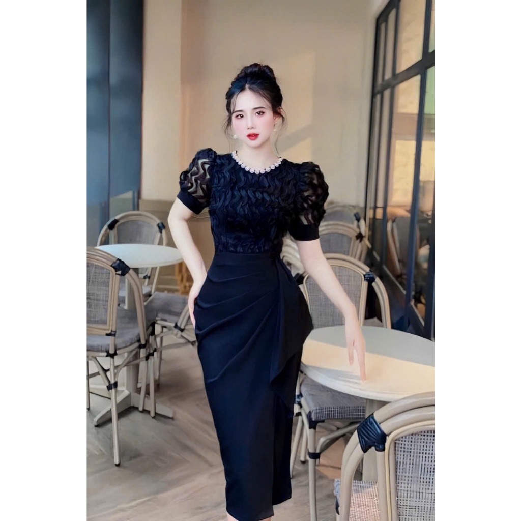 Đầm Nữ Thiết Kế Sang Chảnh Cổ Tròn Đính Đá Tay Bồng Phối Ren Sóng Nổi Dáng Dài Nhún Hông Sang Chảnh Dự Tiệc SP010169