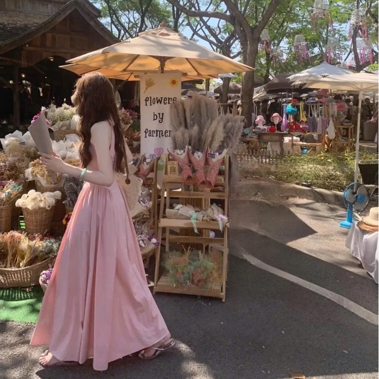 Váy Nữ Thiết Kế Cổ Yếm Phối Viền Ren Thắt Nơ Xinh Chiết Eo Maxi Dáng Xoè Tone Hồng Nàng Thơ Mộng Mơ