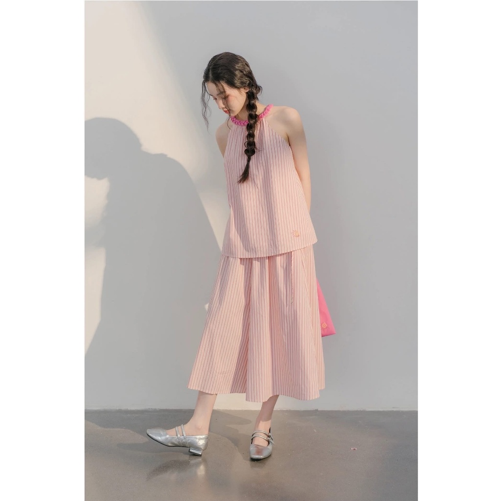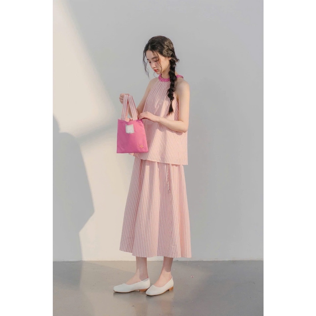 Set Đồ Nữ Áo Cổ Yếm Babydoll Kẻ Hồng Pastel Phối Chân Váy Midi Dáng Xoè Vibe Nàng Thơ