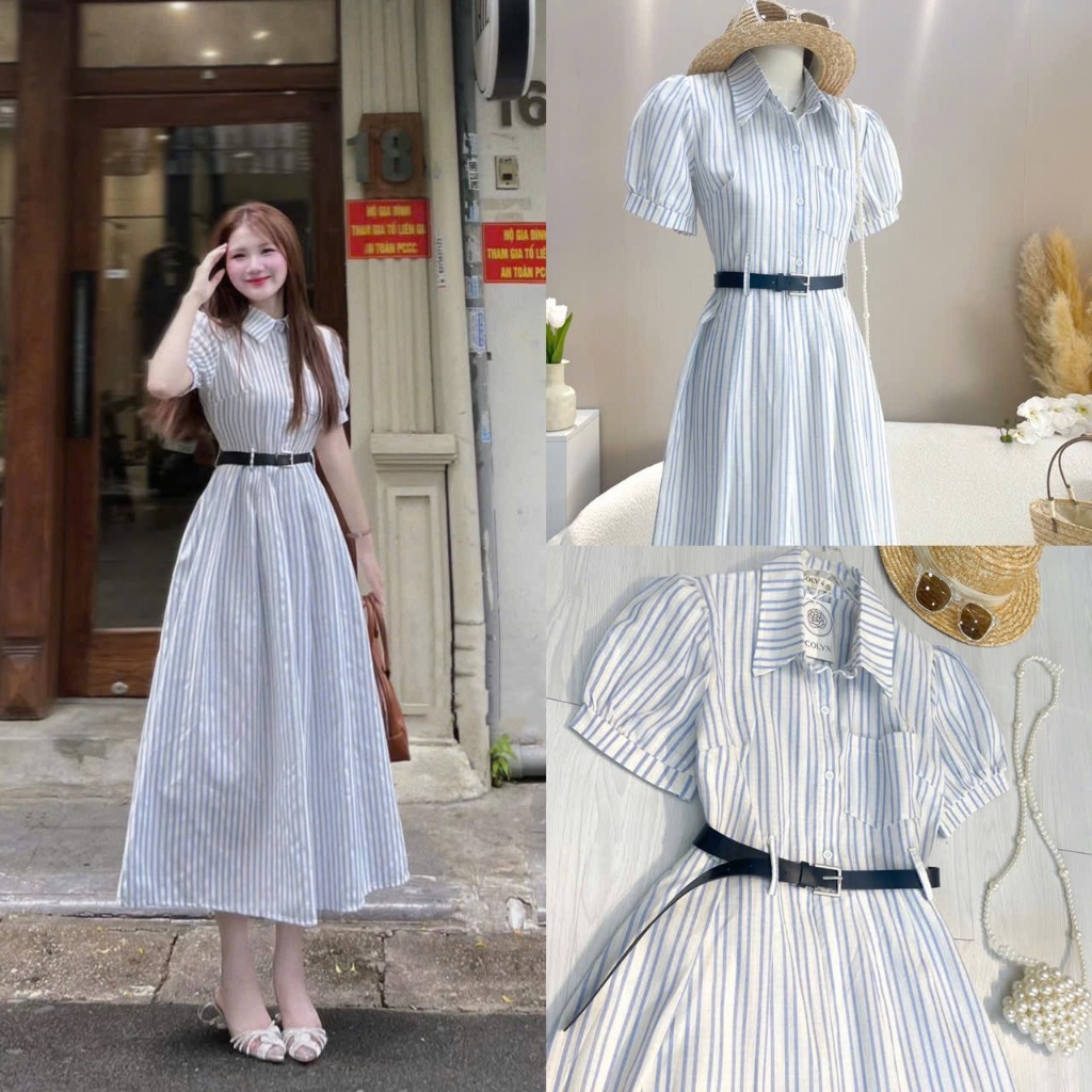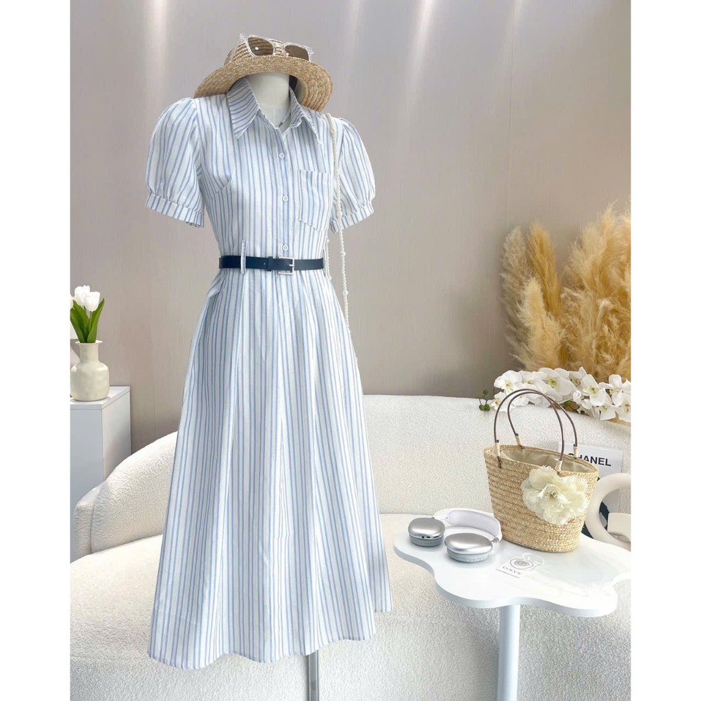 Đầm Váy Nữ Thiết Kế Kẻ Xanh Cổ Đức Tay Bồng Midi Dáng Xòe Phối Thắt Lưng Thanh Lịch VibeTiểu Thư Ngọt Ngào SP010197