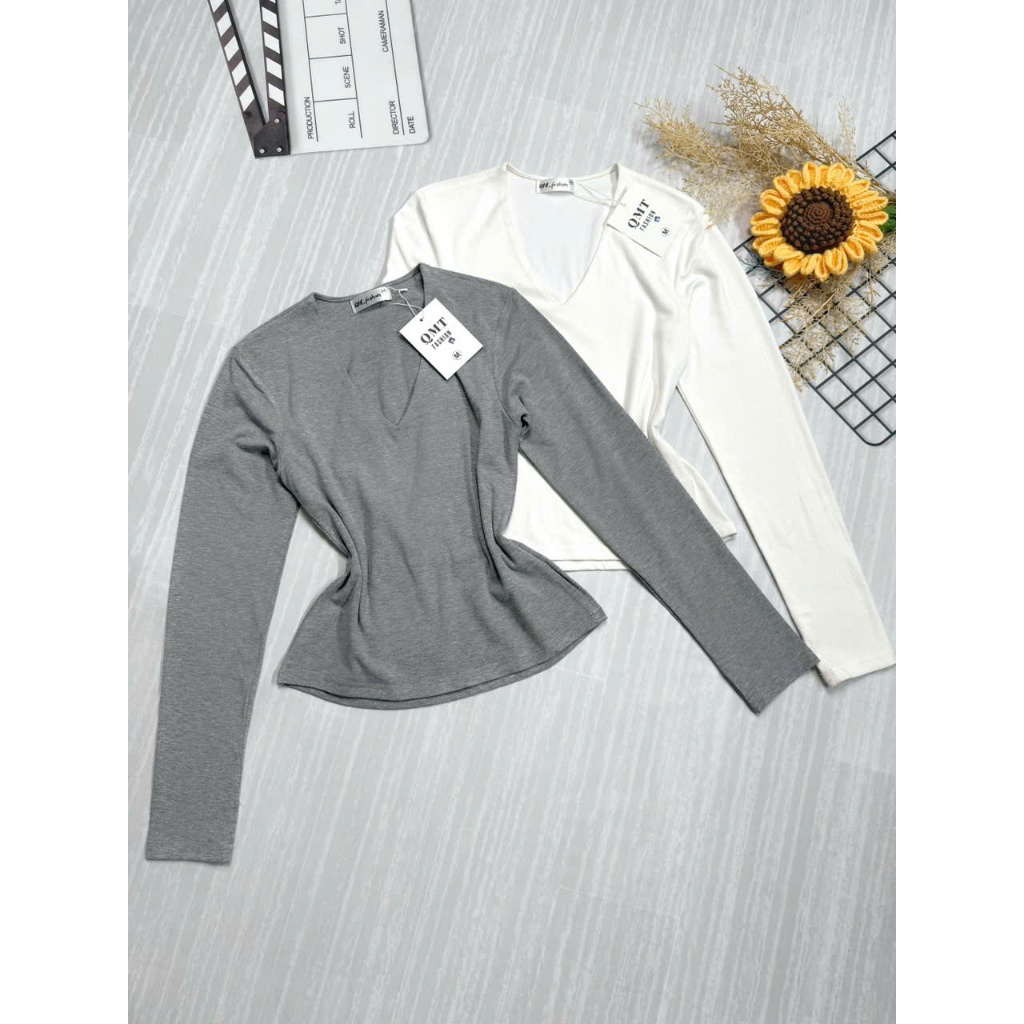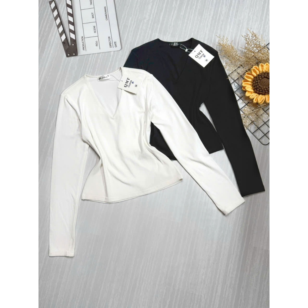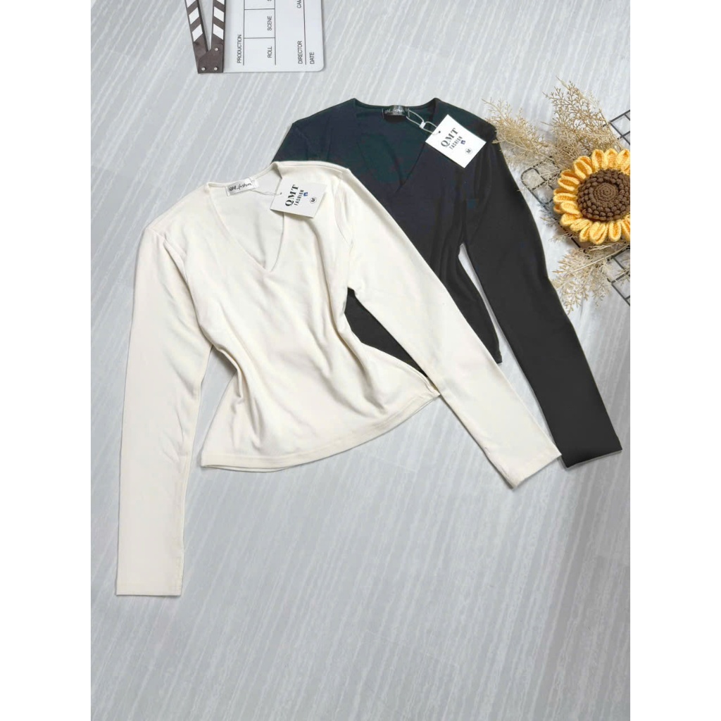 Áo Thun Tay Dài nữ chất Cotton mịn mát ôm body cổ tim khoét may 2 lớp fit ngực, vải co giãn 0835