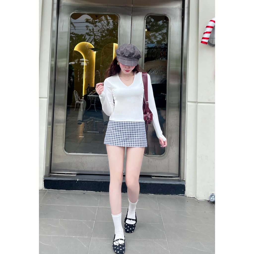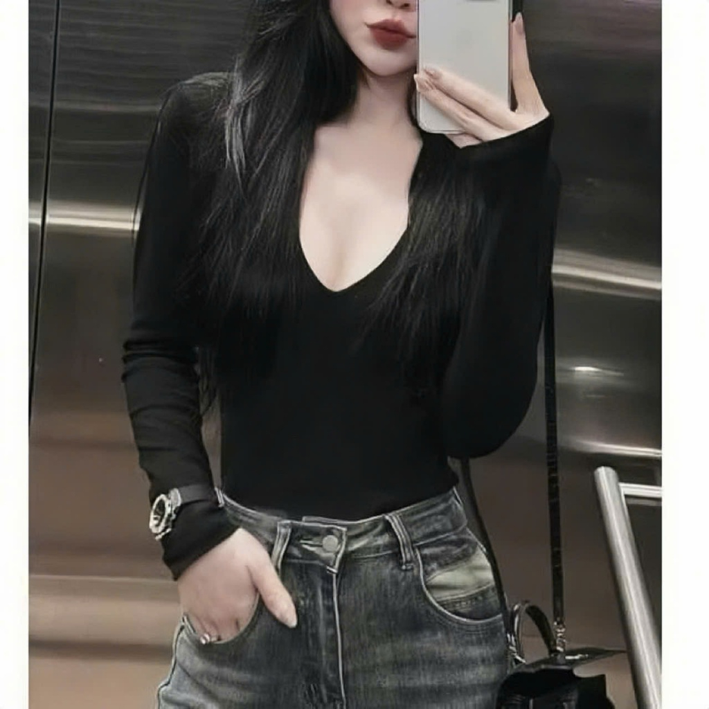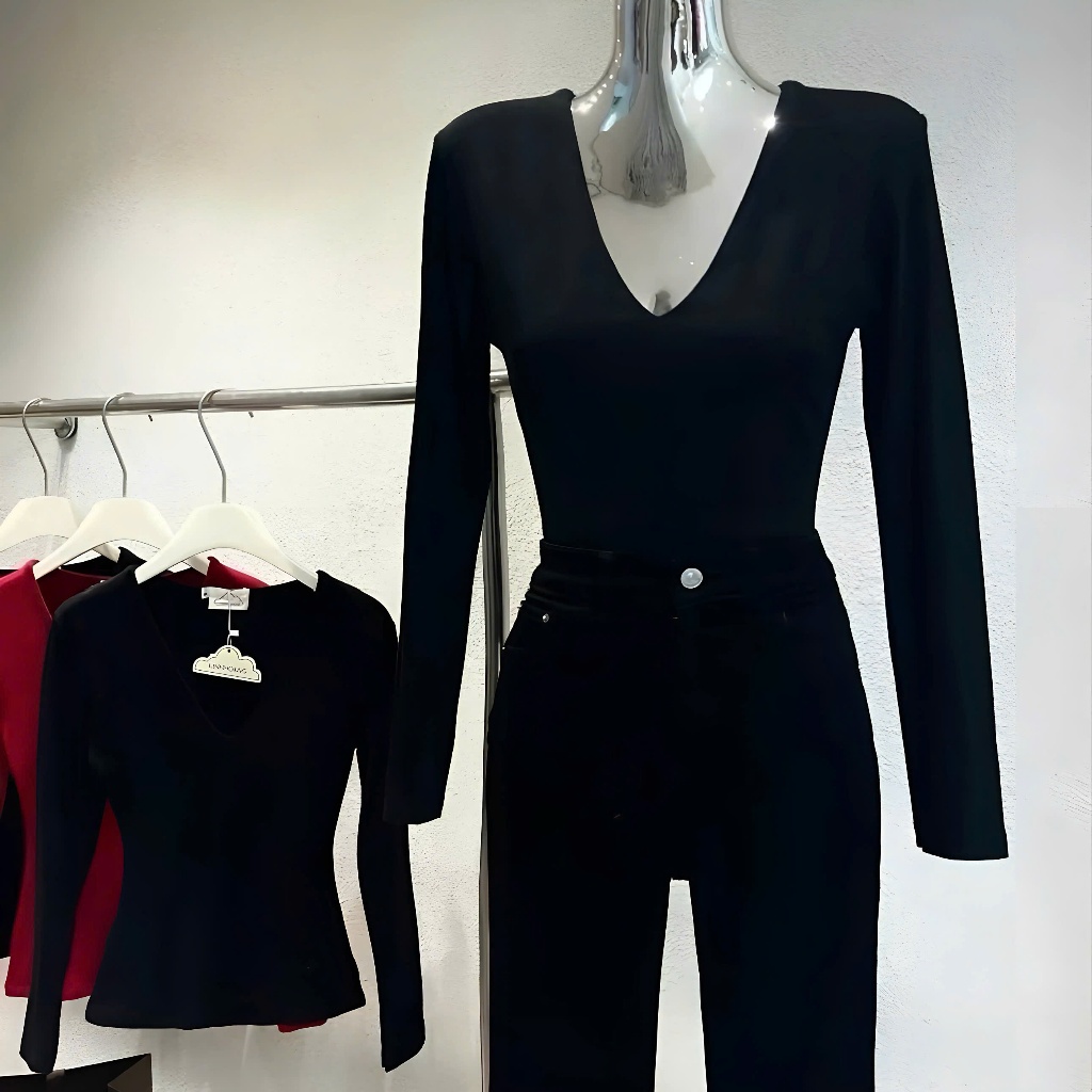 Áo Thun Tay Dài nữ chất Cotton mịn mát ôm body cổ tim khoét may 2 lớp fit ngực, vải co giãn 0835