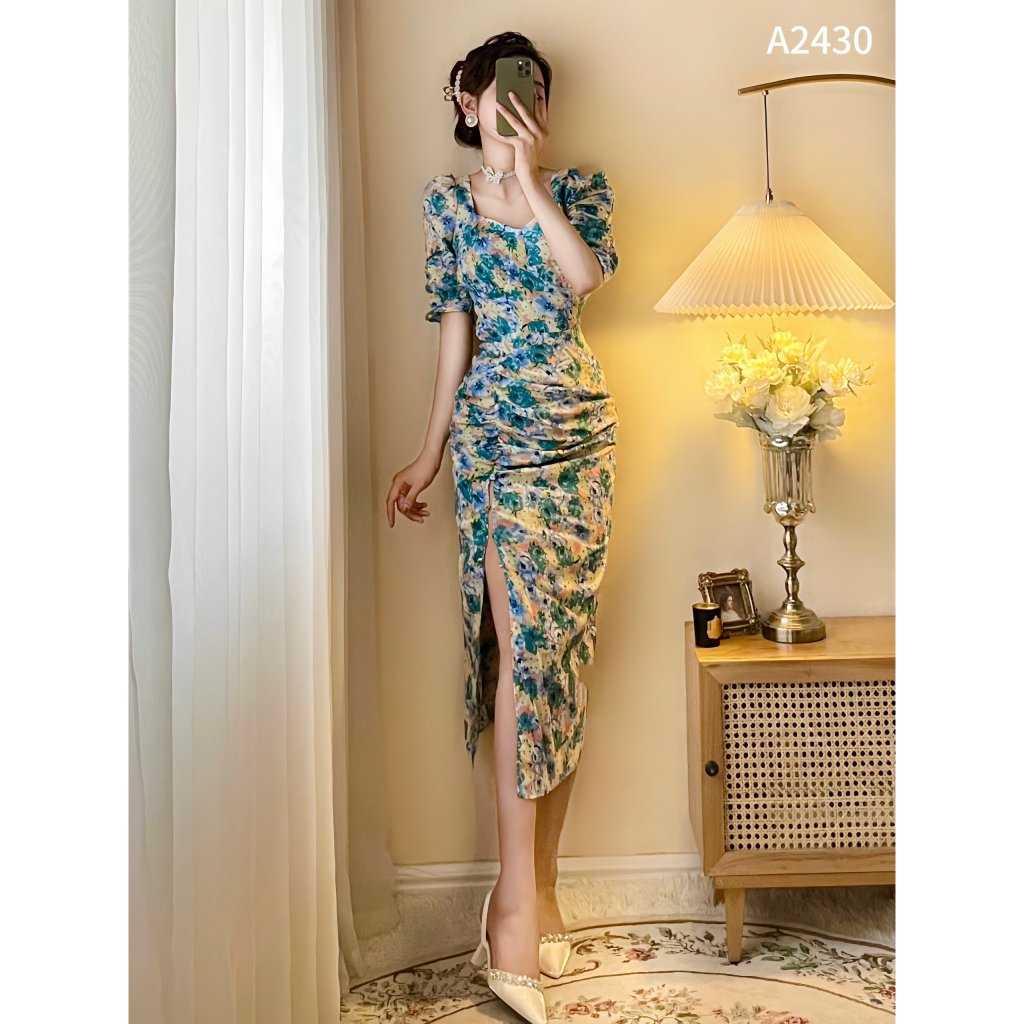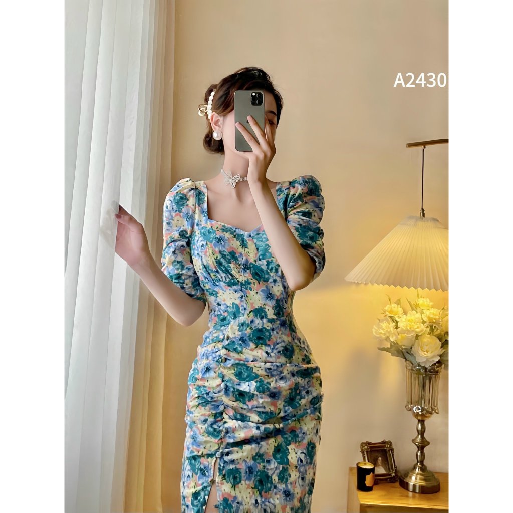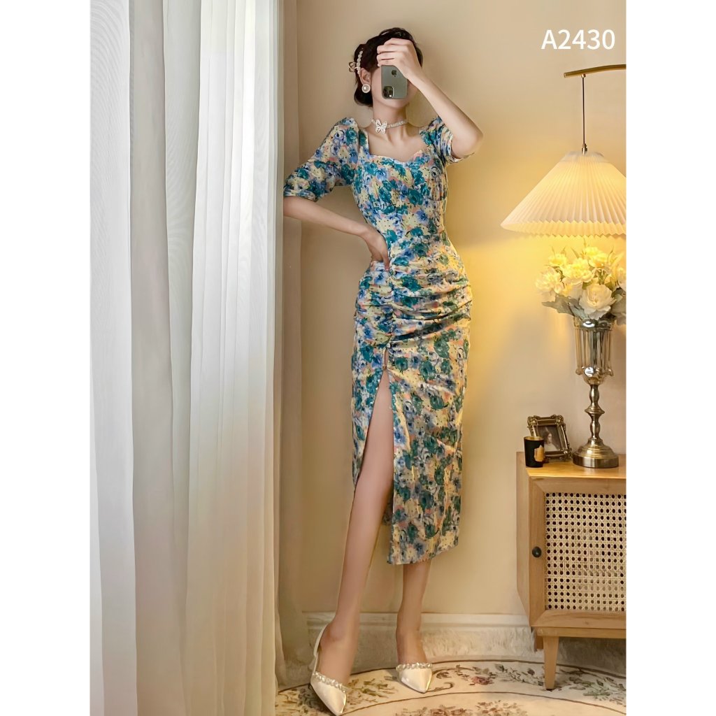 Đầm midi hoa cổ V nhún sườn 1 màu hoa xanh A2430