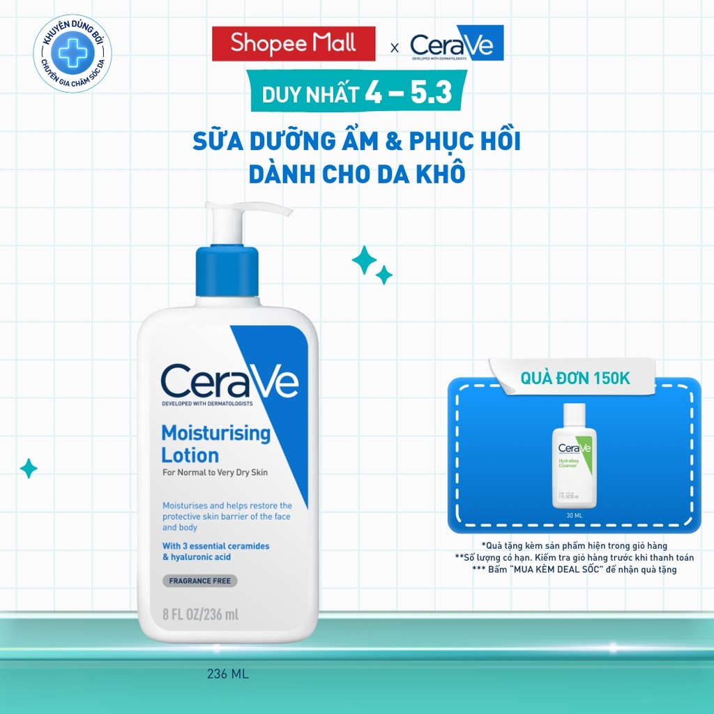 Sữa dưỡng ẩm phục hồi chuyên sâu và giữ da ẩm mịn suốt 48H, duy trì hàng rào bảo vệ da CERAVE MOISTURISING LOTION 236ML