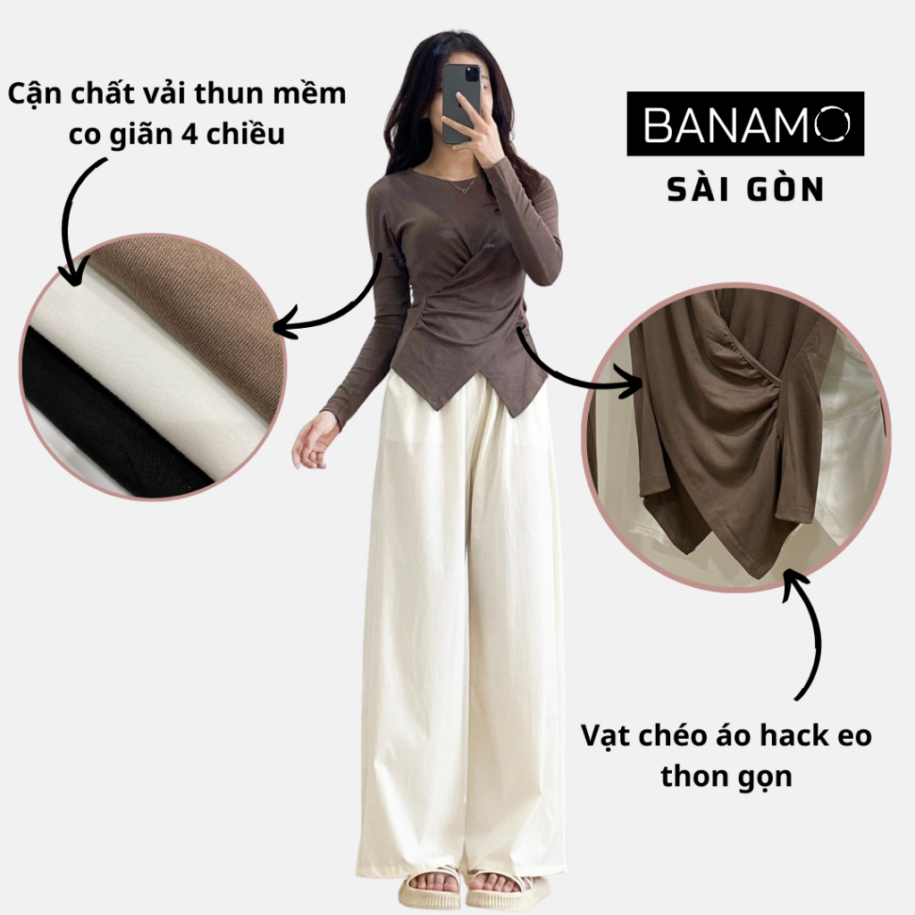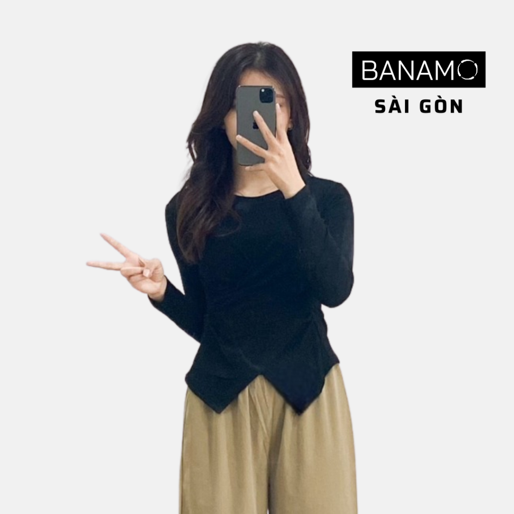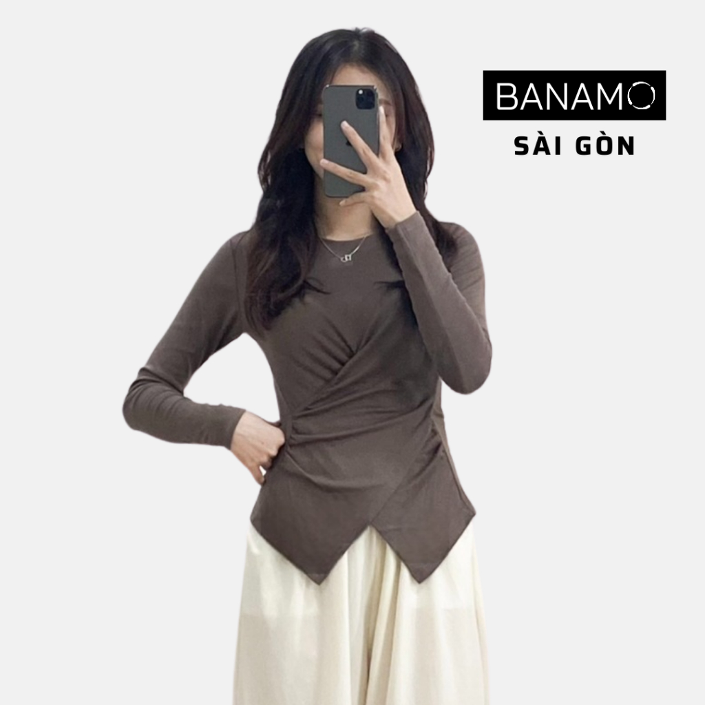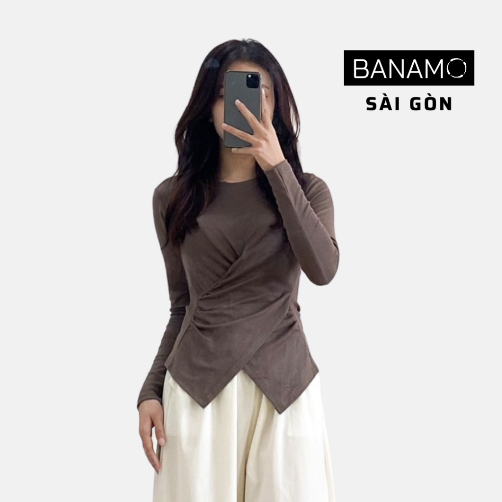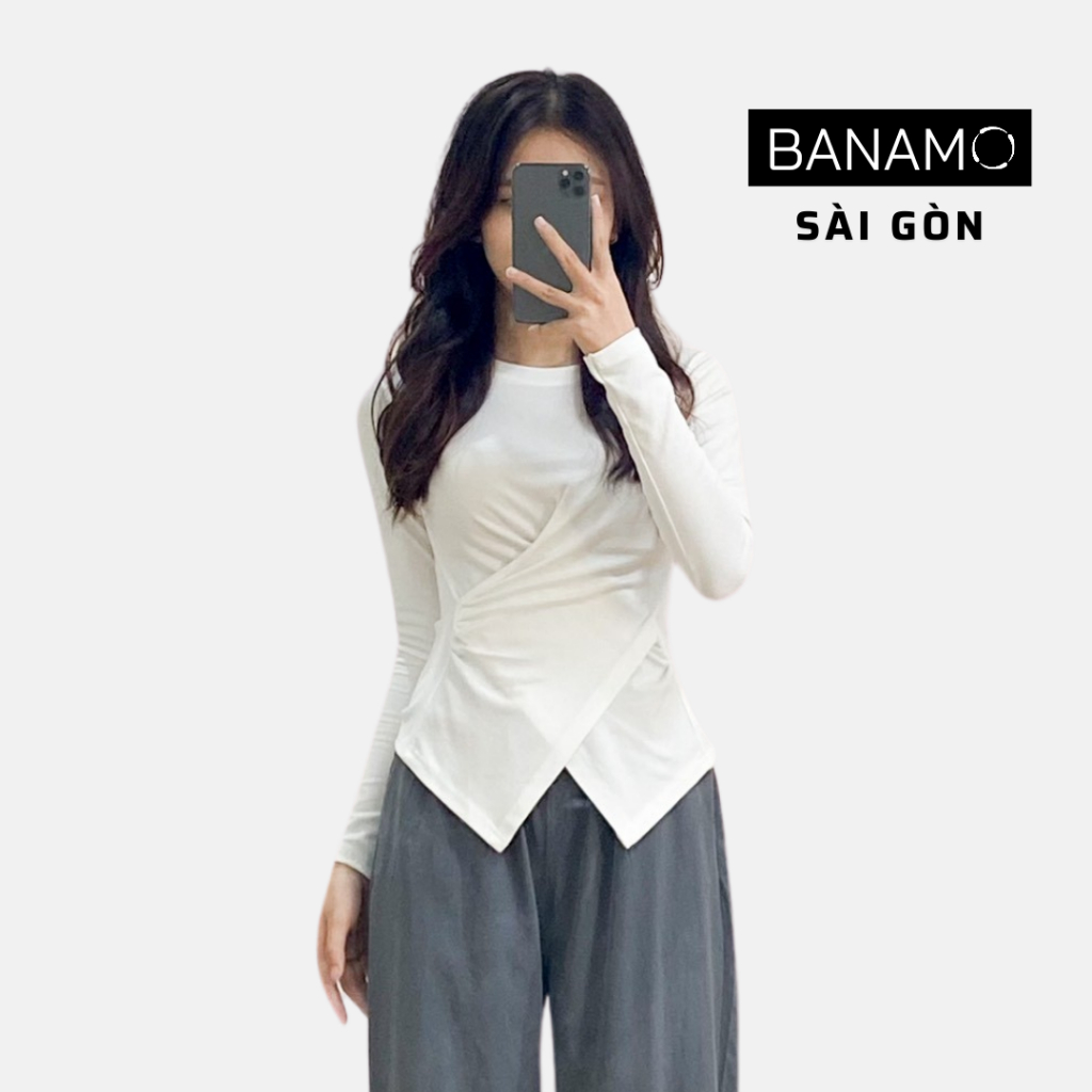 Áo thun nữ bigsize Banamo Sài Gòn áo thun trơn dài tay nhúm eo vạt chéo 3113