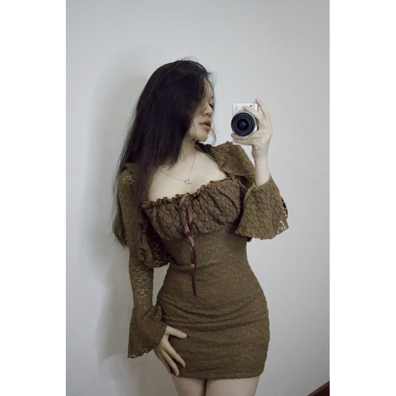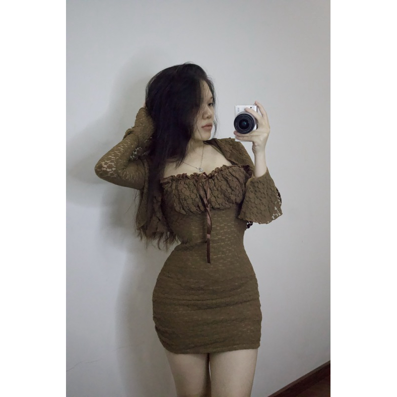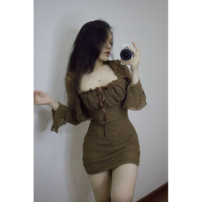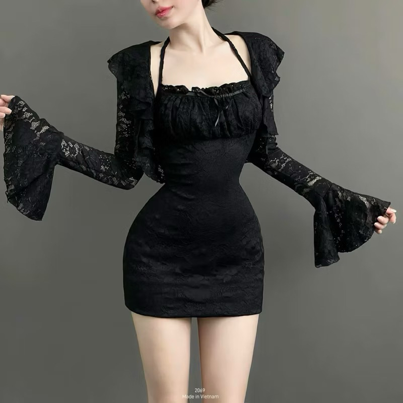 [ CÓ BIGSIZE ]Set váy ren tiểu thư dáng "YẾM CỘT" dây kèm khoác tay dài loe sang chảnh ôm body tôn dáng thời trang