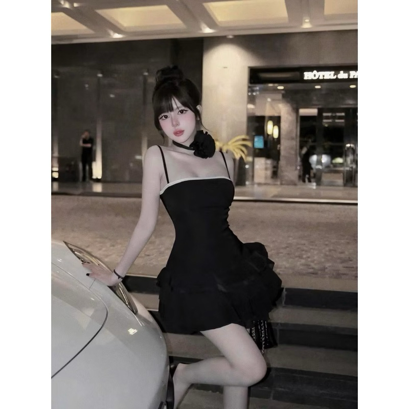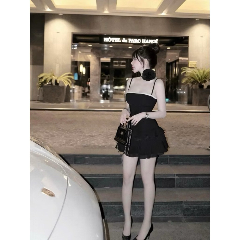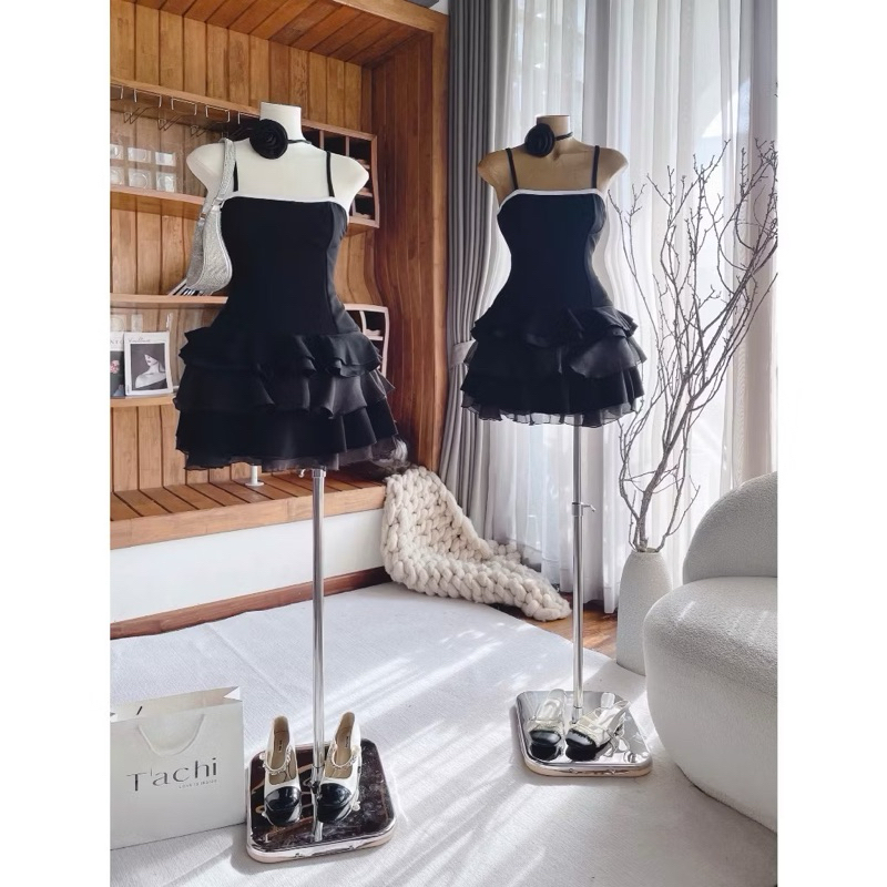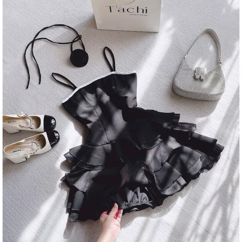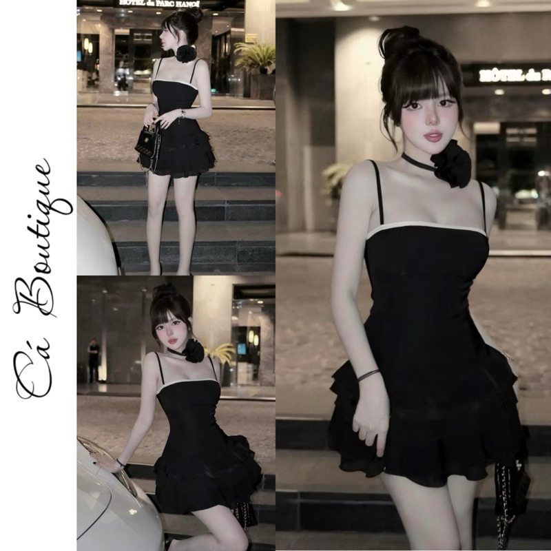 𝐒𝐀𝐋𝐄 𝐗𝐀̃ 𝐊𝐇𝐎 ĐẦM ỐNG ĐEN 2 DÂY VIỀN TRẮNG NGỰC LAI BÈO 3 TẦNG XÒE KÈM CHOKER HOA ĐEN Cá Boutique
